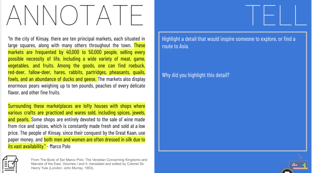 Annotate and Tell (8 minutes): The next phase involved an Annotate and Tell activity, focusing on a passage from Marco Polo’s writings. Students spent time annotating the text, underlining or highlighting key sections that illustrated how Polo’s stories inspired European curiosity and exploration. They then shared these annotations with the class, fostering discussion about how historical narratives shaped exploration. This part helped students connect primary source analysis to the broader motivations for European exploration, further deepening their historical thinking skills.