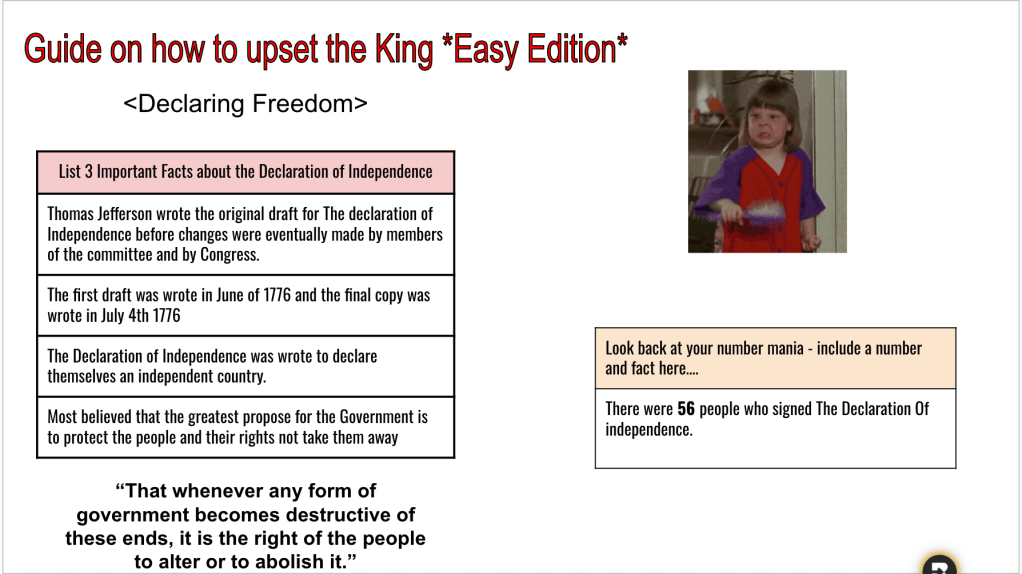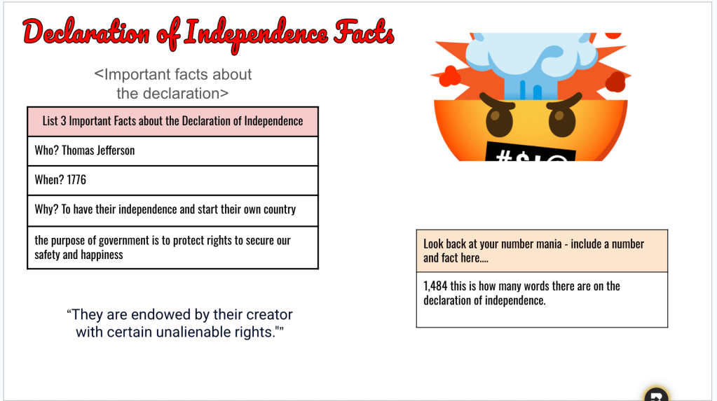 For the Declaration, I left a Thick Slide assignment designed to help students synthesize what they’ve learned. They were tasked with listing three facts about the Declaration, explaining why it was written, and defining the purpose of government. To add a layer of historical analysis, I had them find a quote reflecting John Locke’s influence and select an image that could show King George’s reaction to the Declaration. It was an opportunity for them to connect the ideas we’ve been exploring and to bring a bit of creativity into the mix.