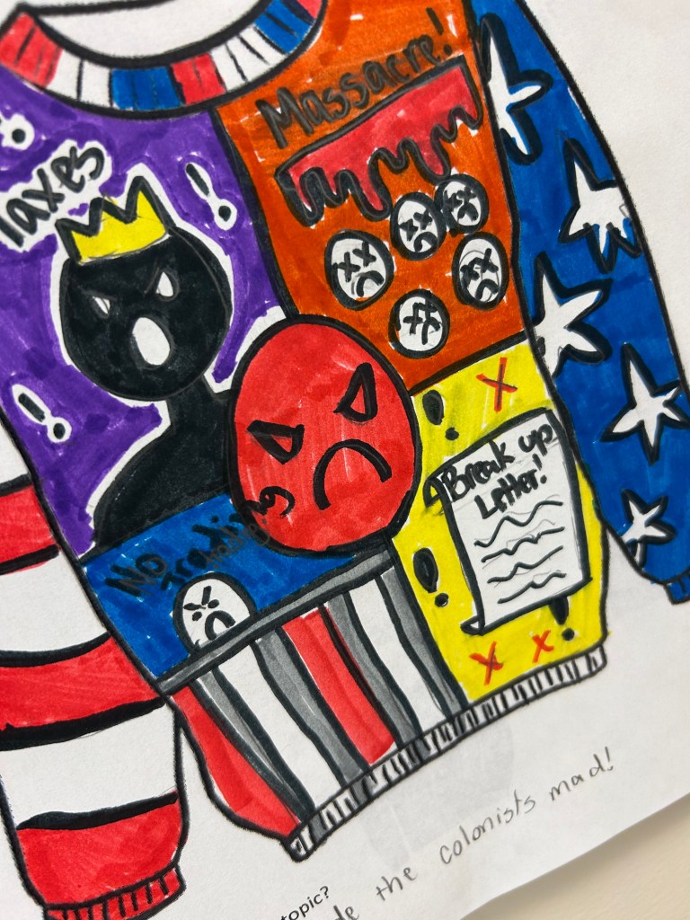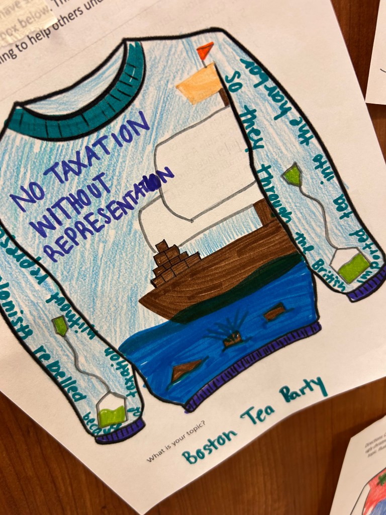 We did an ugly Christmas sweater party, but not the store-bought kind. We made them history-style. Students could choose any topic we covered during the first part of the school year and turn it into an ugly sweater design. Ideas were everywhere. Colonization, natural rights, mercantilism, battles, documents. Markers, paper, and laughter took over the room.