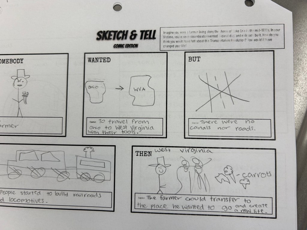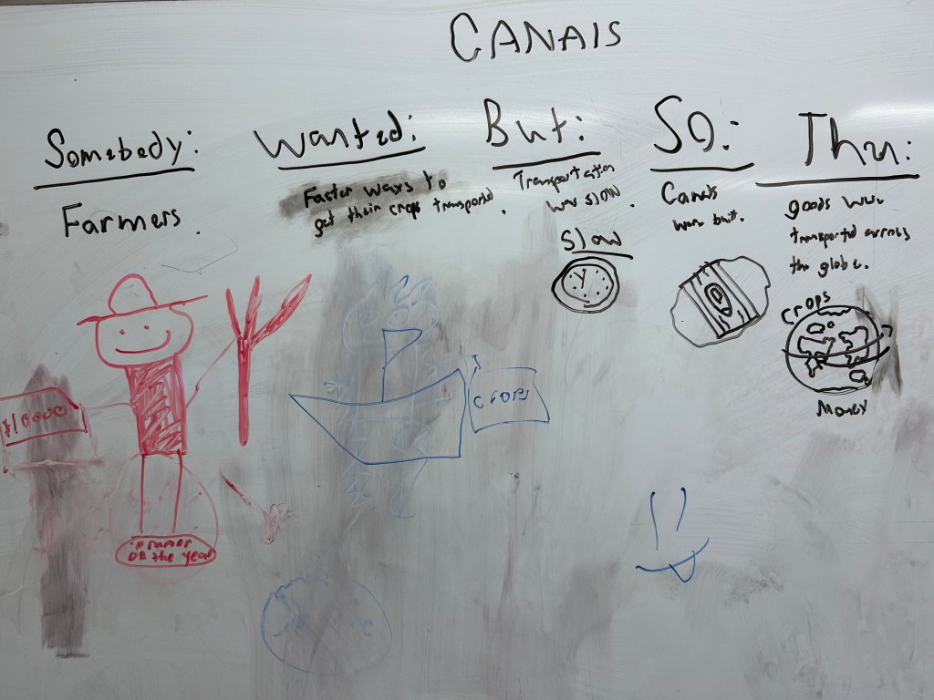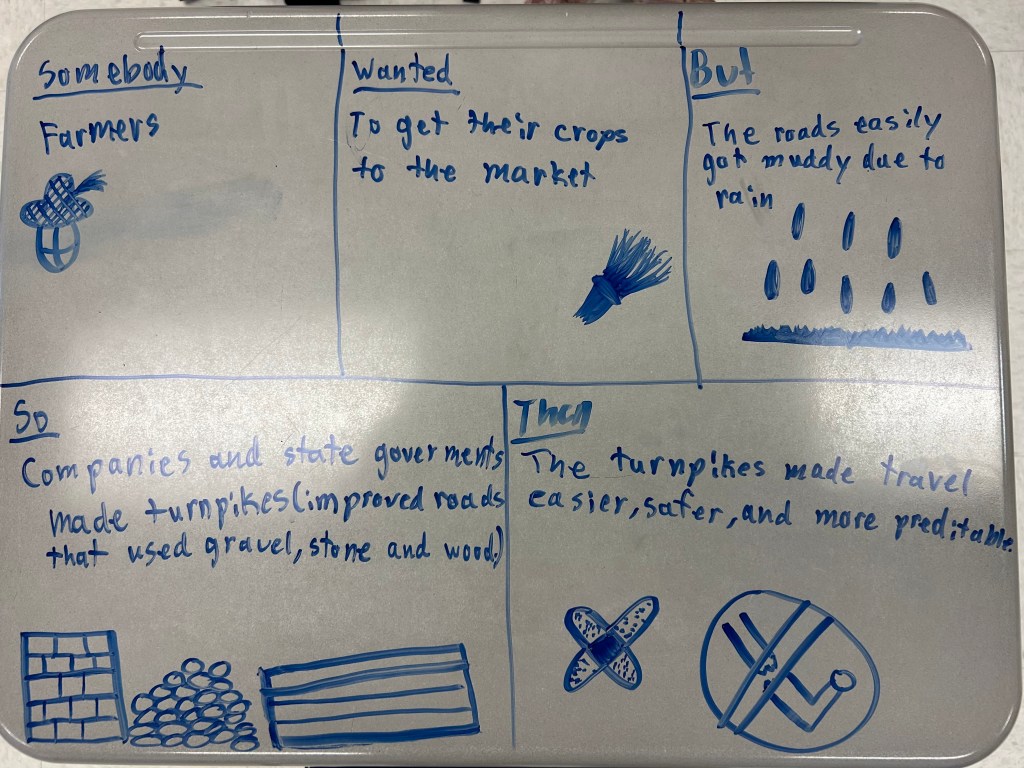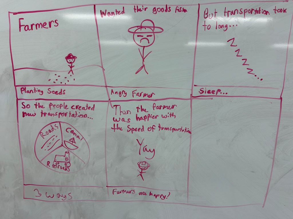 We finished by shifting perspective. Students imagined they were a farmer during the Transportation Revolution and reacted to one method using a Somebody Wanted But So Then sketch and tell. Some chose paper while others stayed at the boards. Either way, they were applying what they learned in a way that made it feel real and connected to an actual experience.