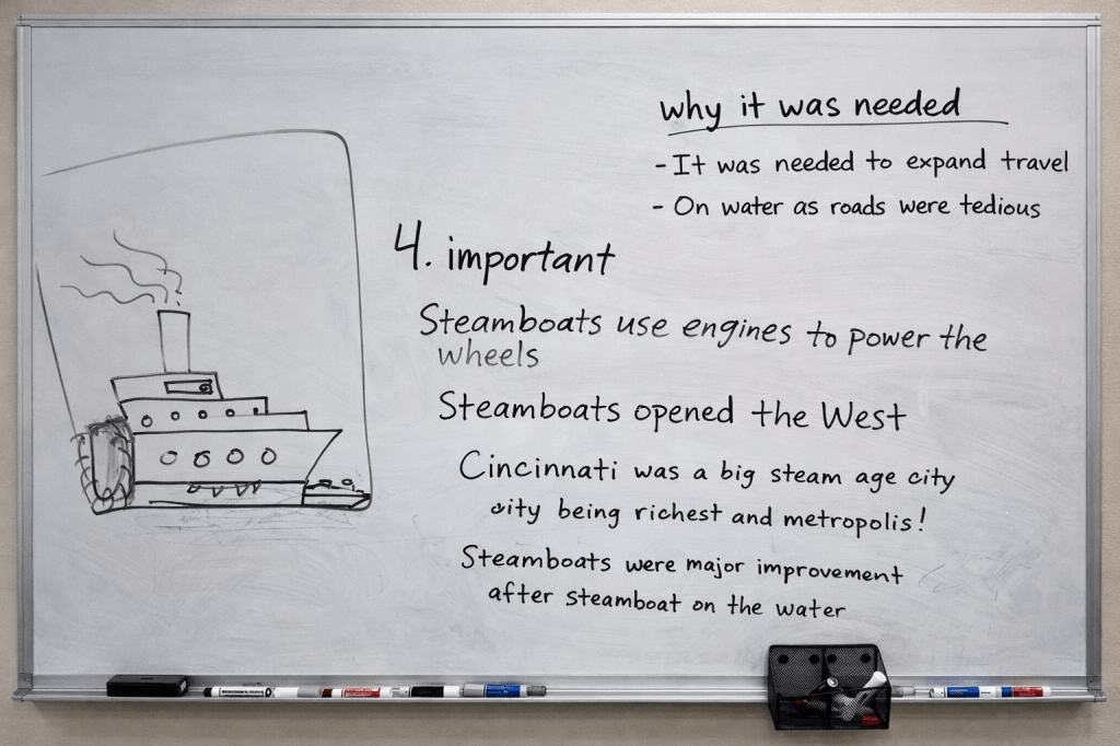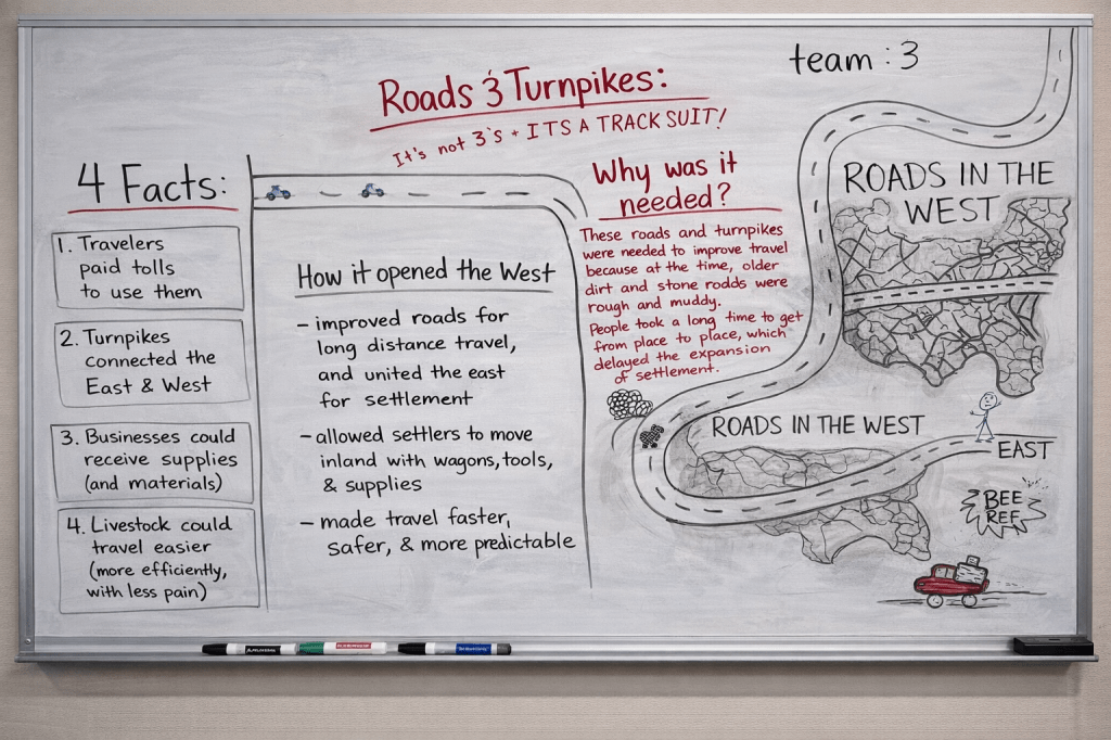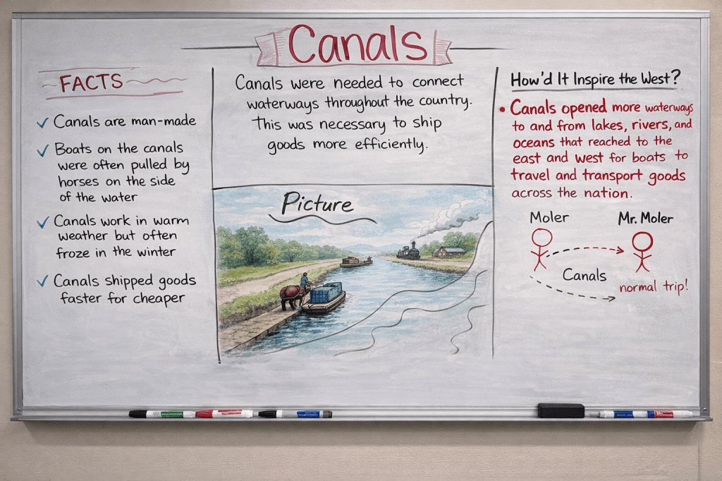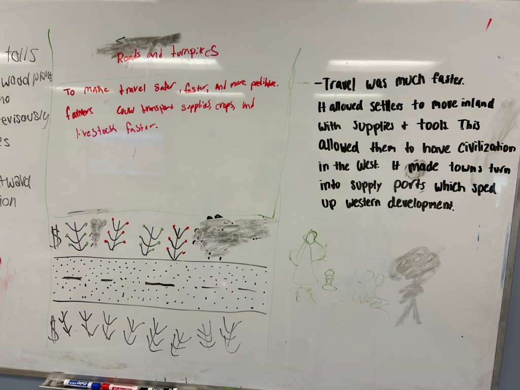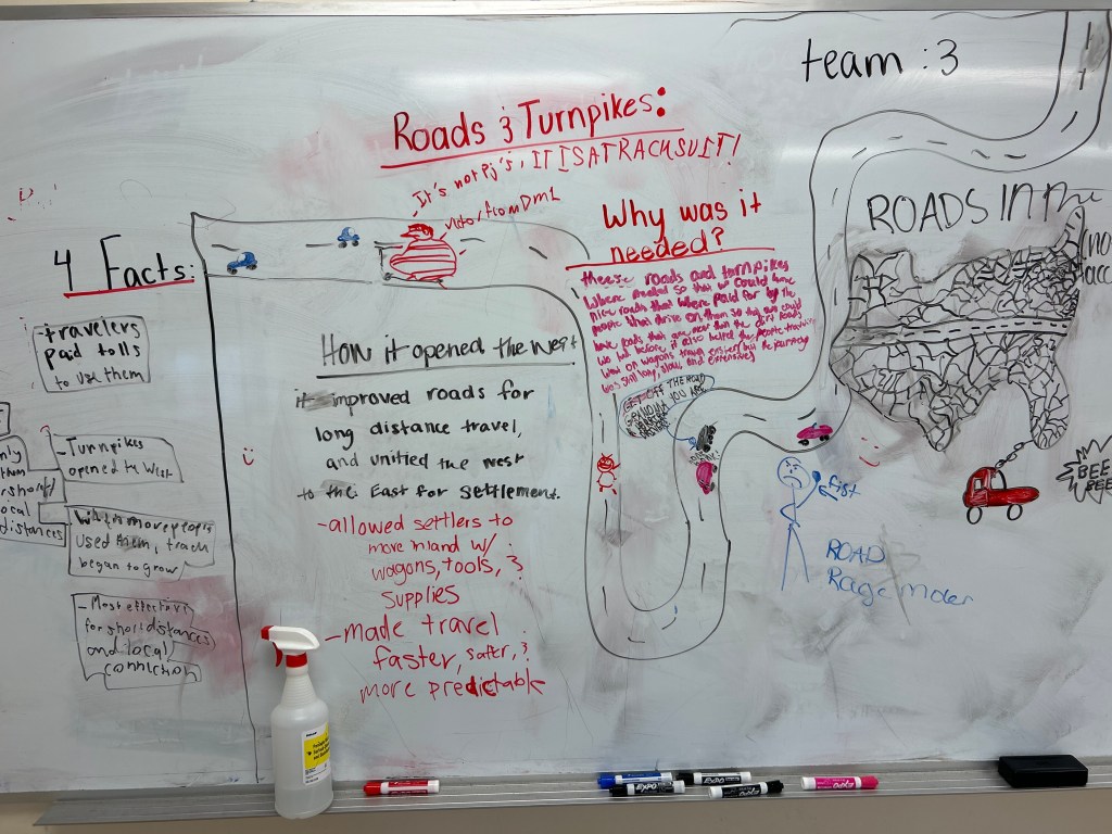We finished by shifting perspective. Students imagined they were a farmer during the Transportation Revolution and reacted to one method using a Somebody Wanted But So Then sketch and tell. Some chose paper while others stayed at the boards. Either way, they were applying what they learned in a way that made it feel real and connected to an actual experience.