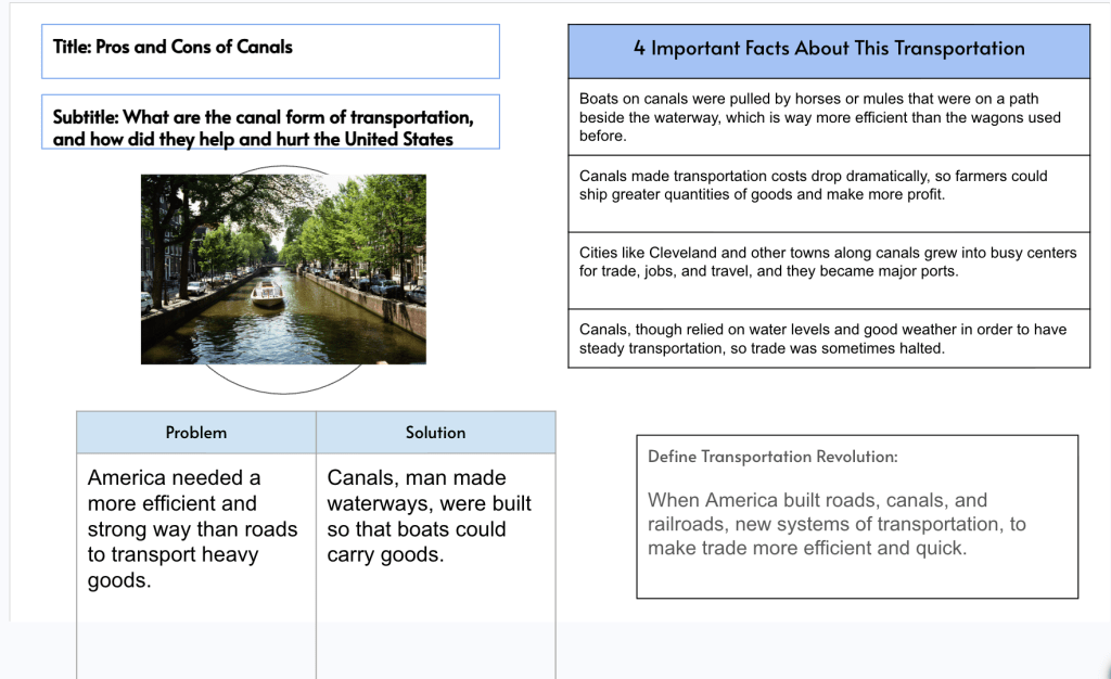 After that, students got readings that built on the same transportation methods from the video. Instead of answering questions, they created a Thick Slide. Some classes used Google Slides, some used paper, and some went to the whiteboards. The structure stayed the same with a title, subtitle, visual, four facts, problem and solution, and a definition of the Transportation Revolution. Students had a clear place to organize everything they were learning without getting overwhelmed.