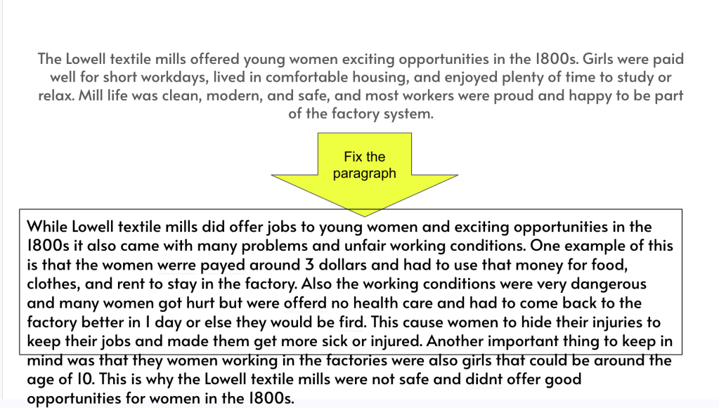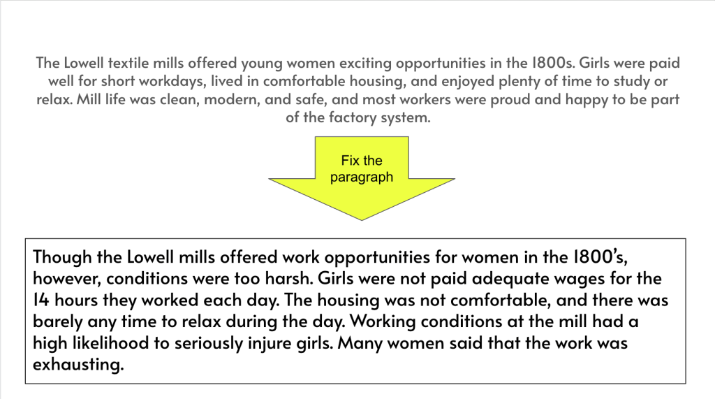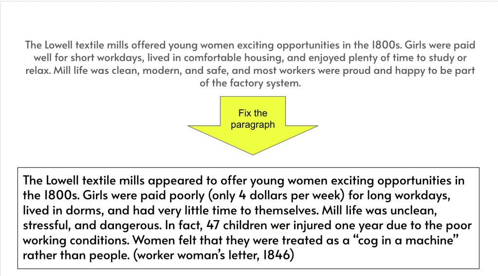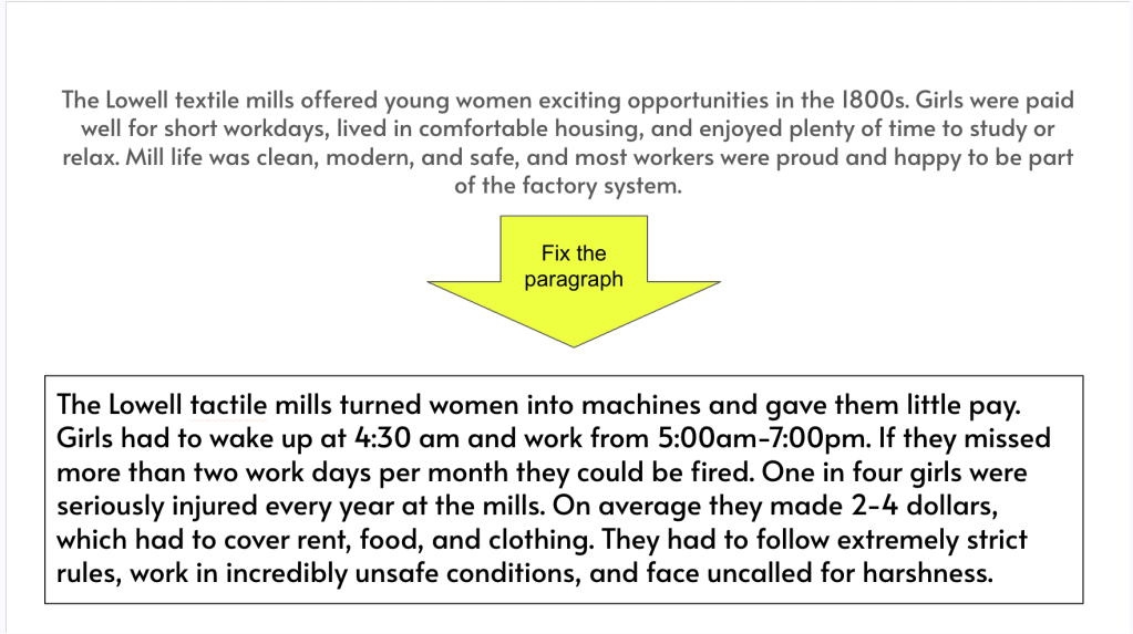 We opened with a simple statement about the Lowell Mills being a positive opportunity for workers. Before diving into anything, I wanted students thinking about that idea and forming an opinion they could test throughout the lesson. It gave them something to come back to instead of just passively taking in information.