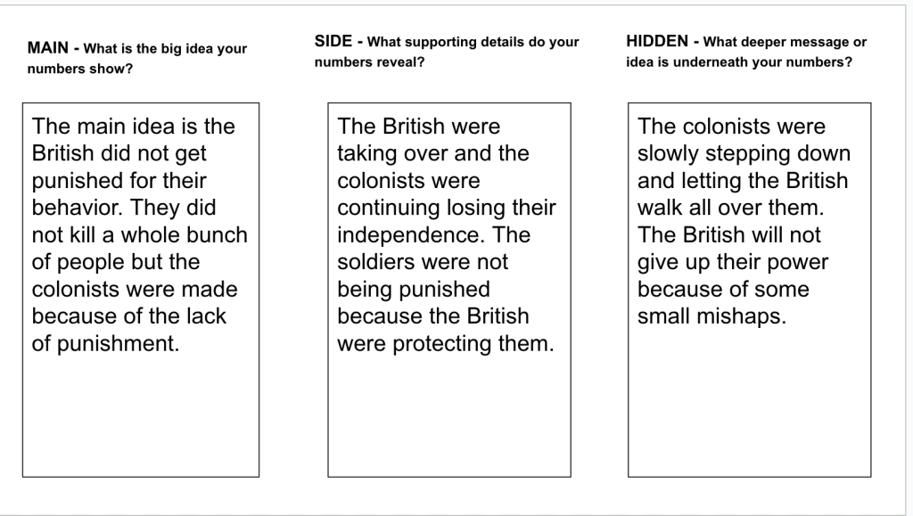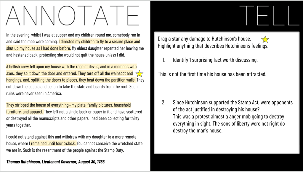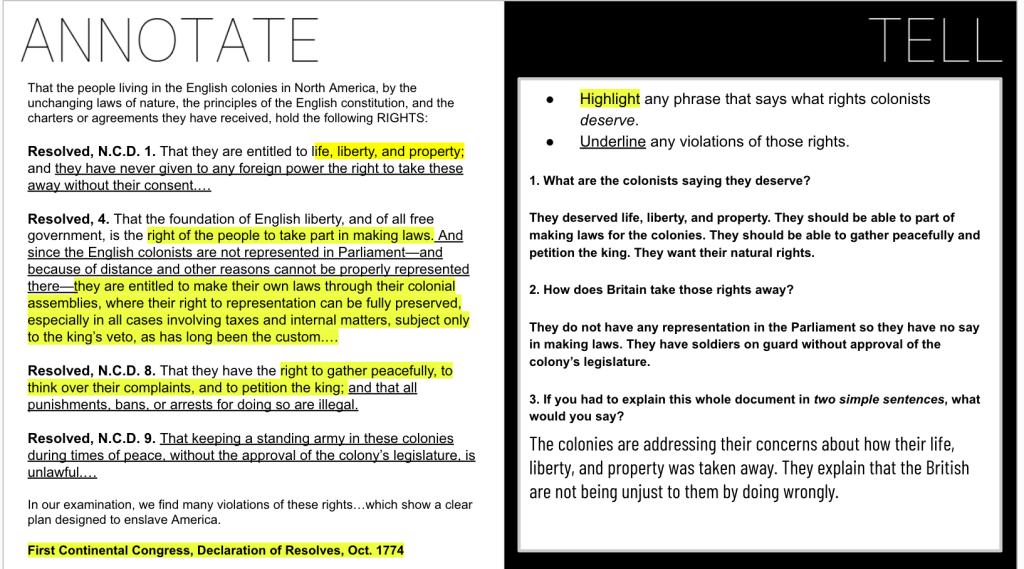 Then we hit the Tea Party and Intolerable Acts using a diary entry from John Adams where he basically predicts the crackdown and knows war is on the horizon. Finally, we closed the chapter with the First Continental Congress and their Declaration of Resolves. Background reading to primary source to short, purposeful chunks. As my friend and co-author Scott Petri always said: “Don’t make your class death by 1,000 primary sources.”