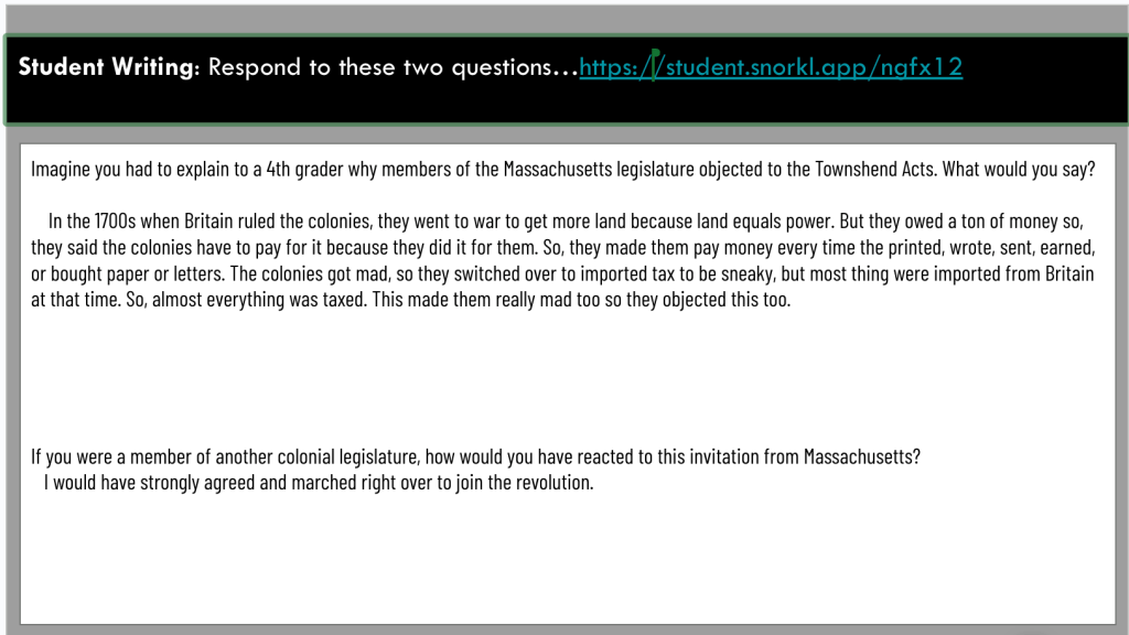 I never really thought about this until I had a brief conversation with two parents this afternoon. They were touring the school, thinking about sending their child here next year, and they stopped by my room. My students were working on their summative assessment for our Road to the Revolution unit. It is an argumentative one pager answering the question, “Why did loyal colonists begin fighting against their own government?”