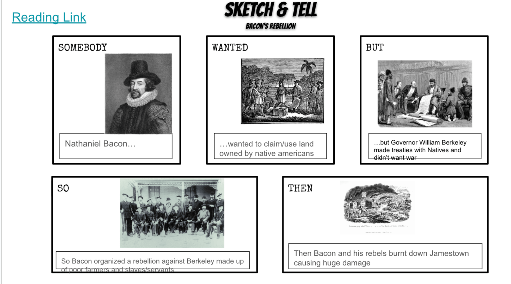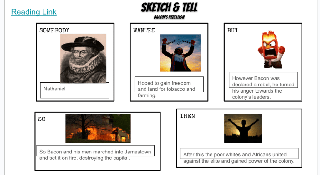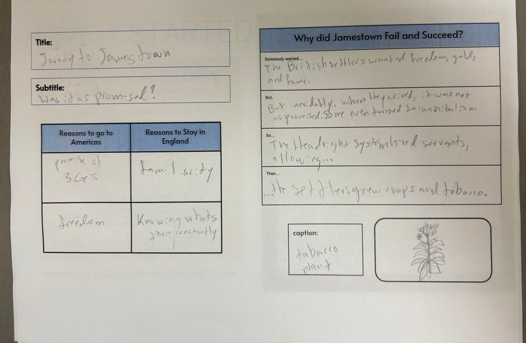 Students then made another Thick Slide using the “Somebody, Wanted, But, So, Then” structure. We closed the loop with How It Started vs. How It’s Going, having students rewrite the Jamestown ad truthfully…no more propaganda.