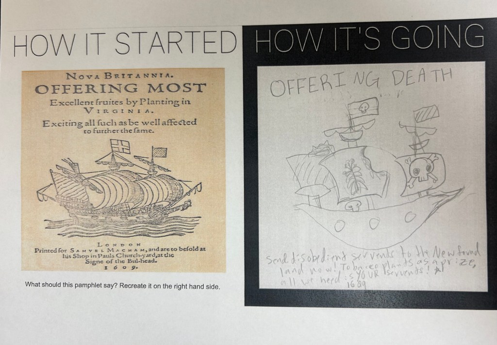 We began with Justin Unruh’s Annotate and Tell Battleship using a real Jamestown advertisement. Students analyzed coordinates on the ad to find small details: promises of gold, comfort, and easy living — and shared their discoveries. The format made close reading competitive and concrete.