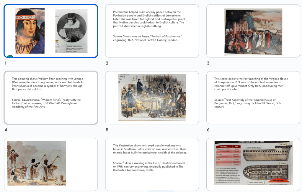 For the last fifteen minutes, the room turned into a gallery walk. I had gone through the textbook, taken photos of eight major images, and uploaded them to ChatGPT. It generated context and sourcing information for each one. I dropped everything into a Google Slides presentation, printed it, and taped the slides around the room.