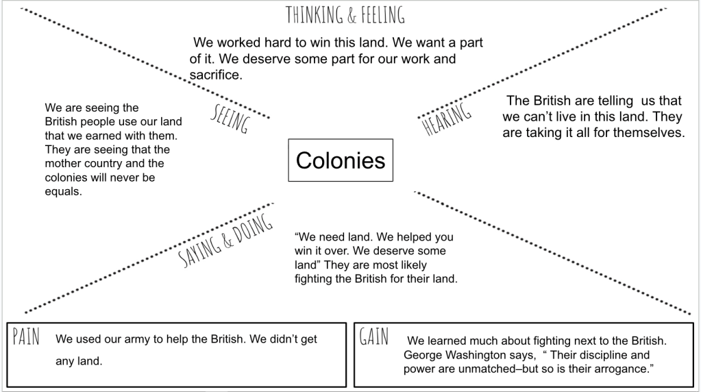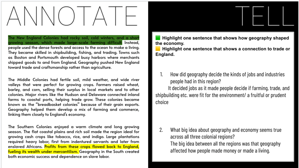 That single question framed the entire unit. Every activity, reading, and discussion tied back to it. When students know the “why,” it changes how they engage, instead of memorizing colony facts, they were weighing survival, opportunity, and risk.
