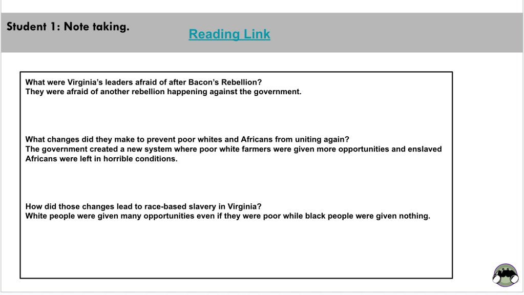 I’ve always believed that going deep into every colony and every small detail is overkill at this stage. Instead, I wanted students to see the broader patterns. So we began at a DOK 1 level—read, transfer notes, and organize into a chart. Then we leveled it up to DOK 2 as students worked together to compare regions using a triple Venn diagram. The conversations that came out of this were some of the best of the week.