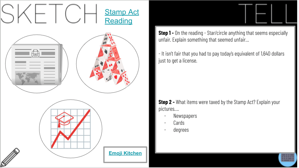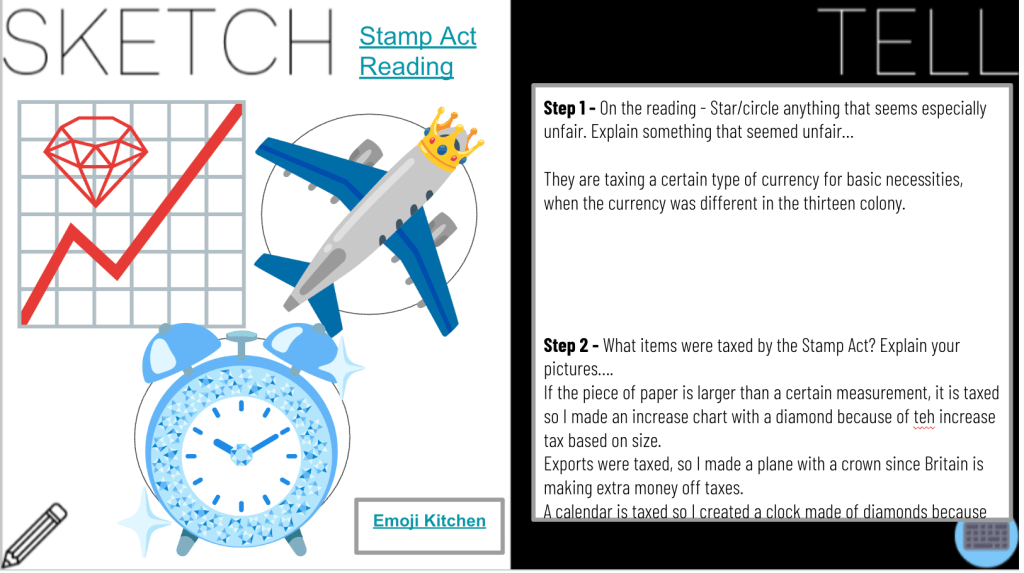 Next, we moved into Parafly, paraphrasing definitions for natural rights and social contract. Instead of stopping at words, students paired their paraphrases with visuals through Sketch and Tell or Emoji Kitchen. This is where things clicked. The images pushed them to internalize the meanings.