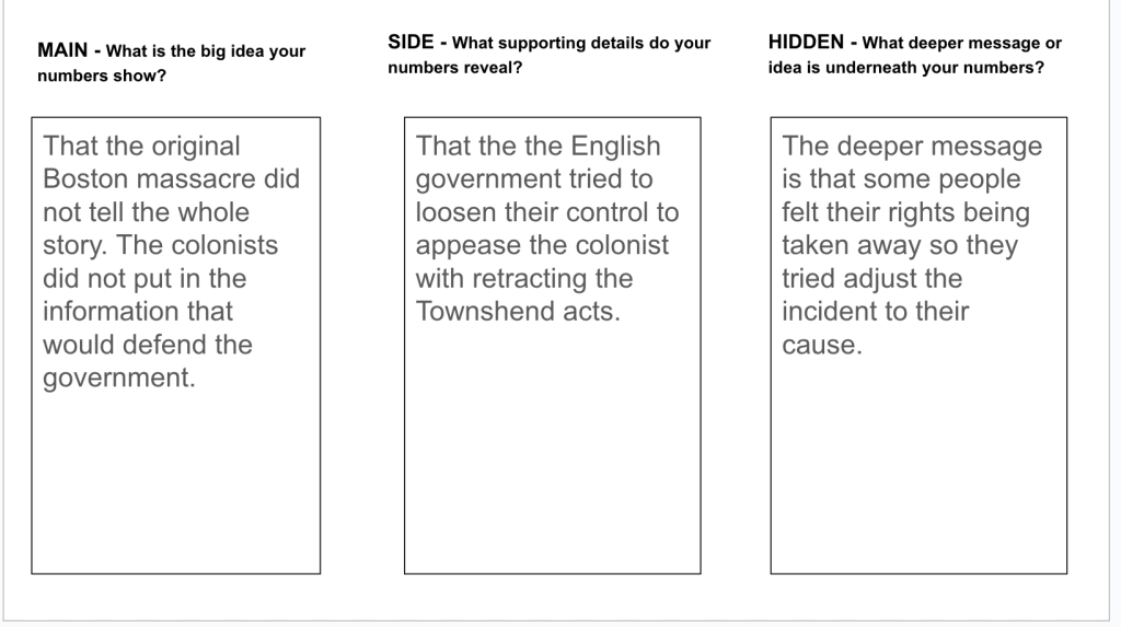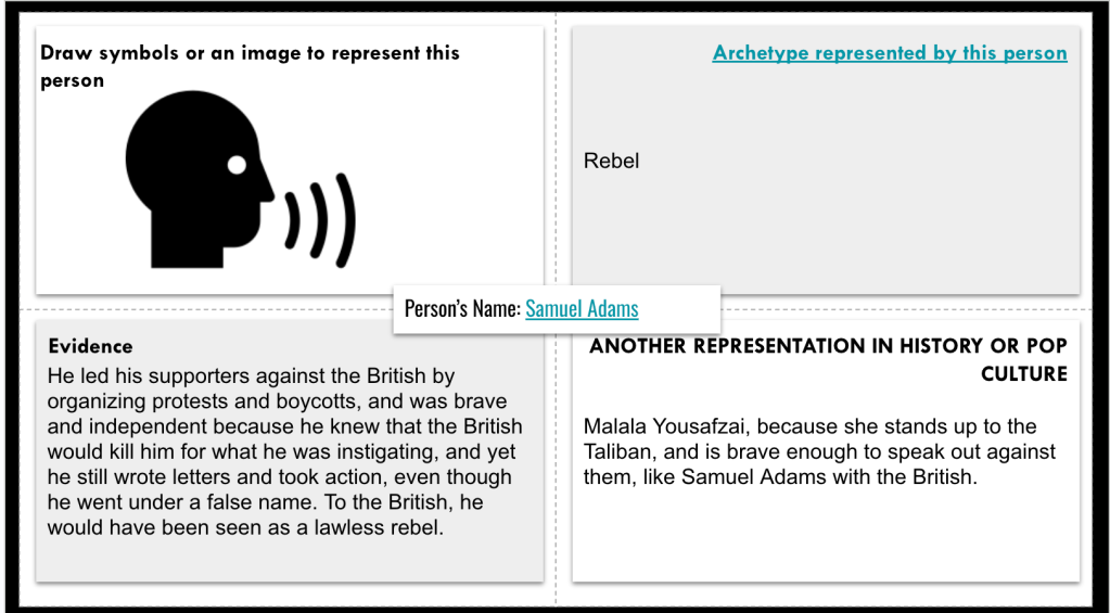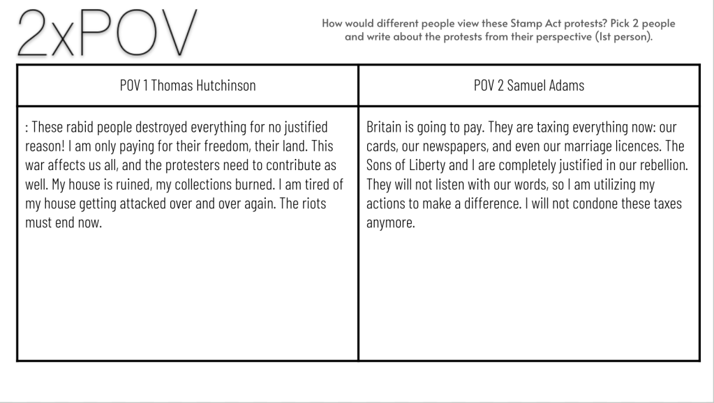 They wrote for three minutes per perspective. I used Hamilton songs as timers. When students wrote as King George, I used You’ll Be Back as the timer, which felt both appropriate and hilarious. The time pressure kept them moving, and the music helped set the tone for each perspective.