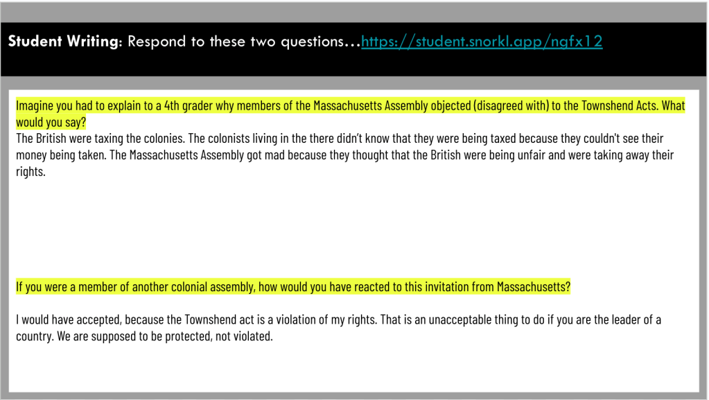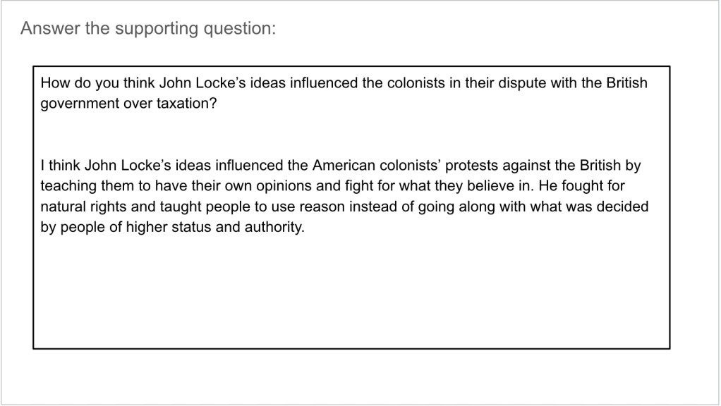 To close the loop, students answered our supporting question: How did John Locke’s ideas influence the colonists in their dispute with the British government?
