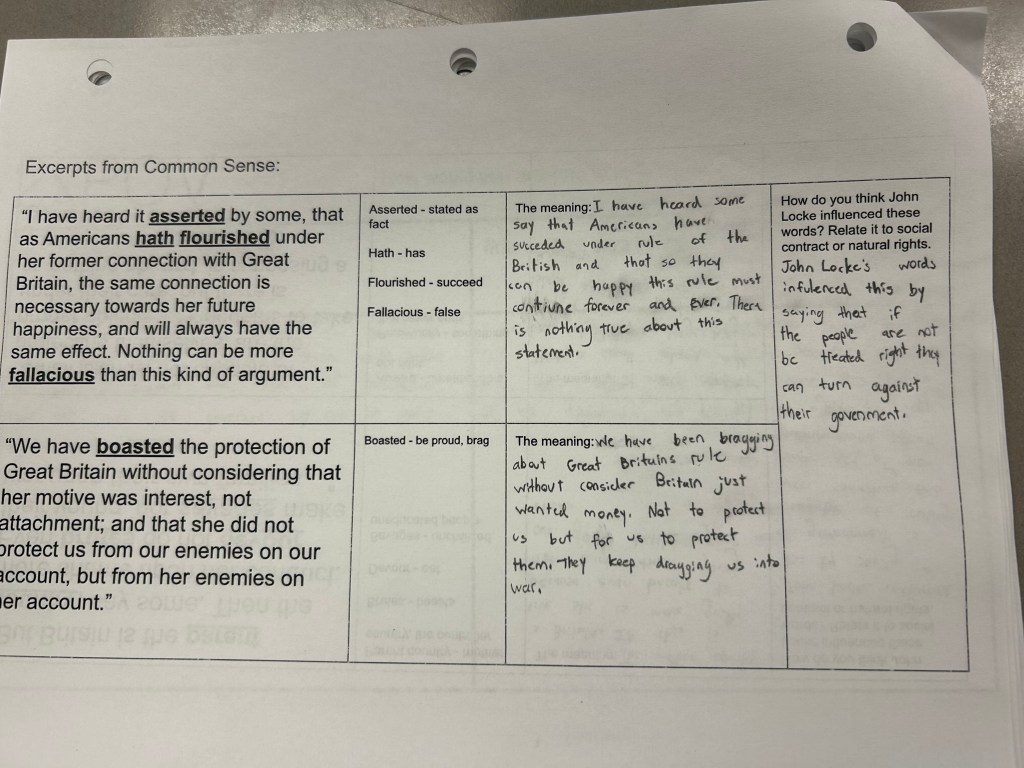As we worked through each section, I challenged students to summarize the meaning using modern language. This was easily one of their favorite parts. They had fun translating eighteenth century ideas into words they would actually use, while still trying to keep the meaning intact.