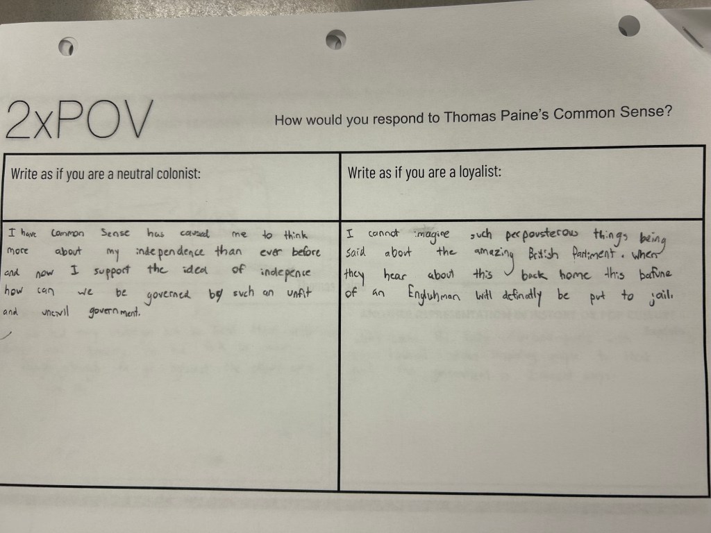 Once students had a solid understanding of the document, we shifted to writing from different perspectives. Students wrote from the point of view of King George, Patriots, and Loyalists.