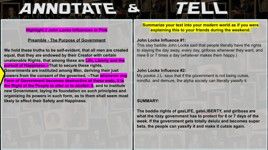 A lot of what came next was inspired by my friend Dominic Helmstetter. He shared a lesson sequence he used with the Declaration that included Annotate and Tell, 3xPOV, Retell in Rhyme, and Taylor Swift. I borrowed heavily and made it my own.