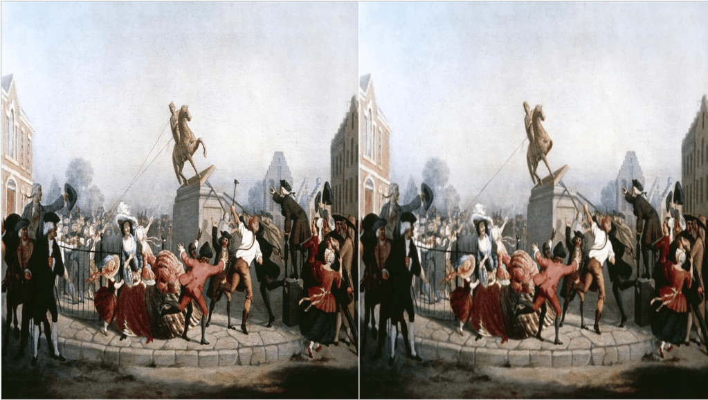 From there, we talked about what happened after the Declaration was approved. It was not just signed and forgotten. It was read aloud throughout the colonies. That moment led perfectly into an image of the King George statue being pulled down at Bowling Green Park in New York City.