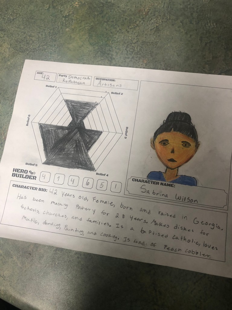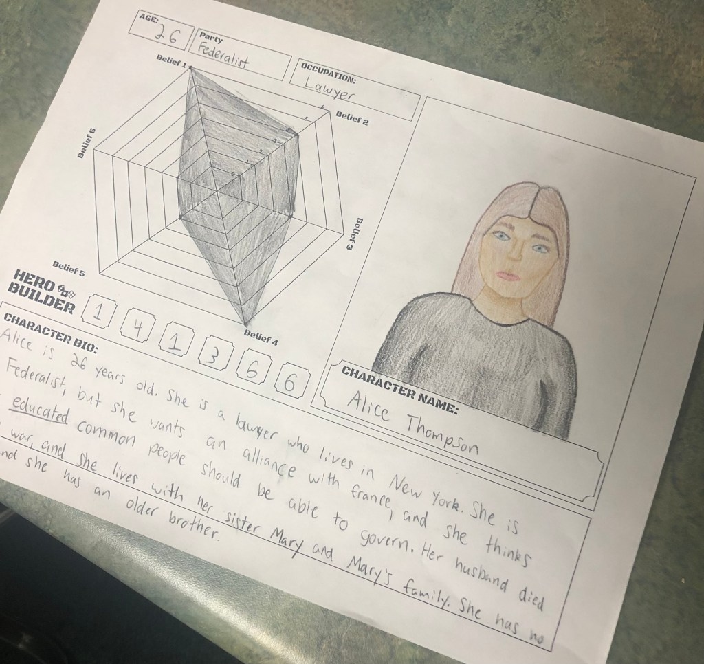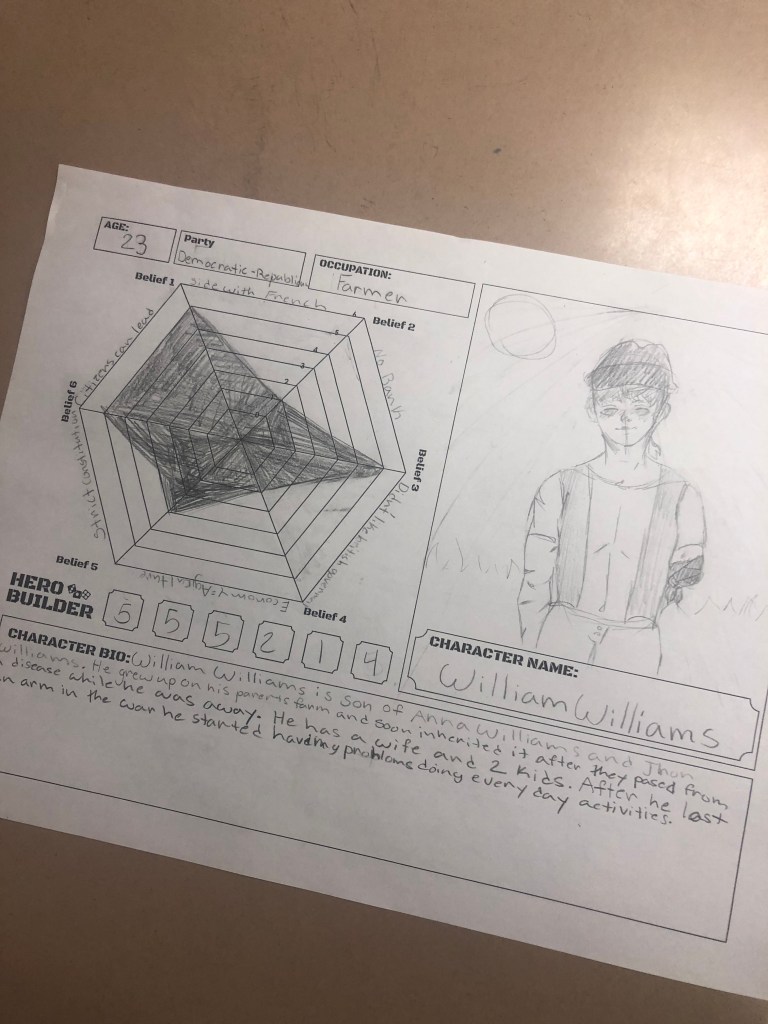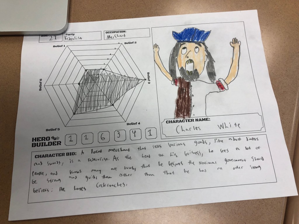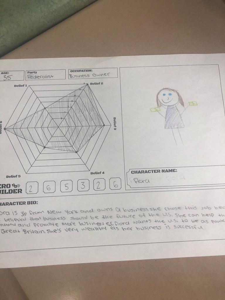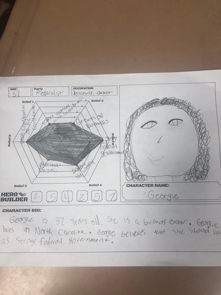 I really liked the Hero Builder (character creator) lesson from EMC2Learning. At first I was unsure how this would fit into the lesson, but it made sense and worked out. Students that created a character with the Hero Builder really loved the idea and were super engaged. Anything that involves dice is always engaging. Students really liked rolling the dice and having to weigh, or apply, values to their beliefs as a Federalist or Democratic-Republican. As a result, they really got into creating their characters. Here are some examples: