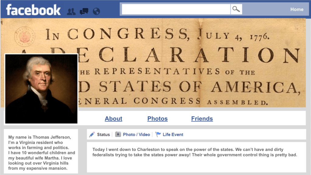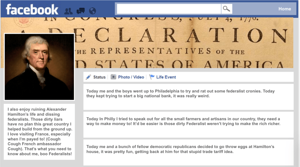 - Facebook profile template – students could create character through a Facebook template. They create posts and add images related to their character and their associated political party. I wish I could remember where I got this template from, but I like this particular template because it’s easy to use and change.