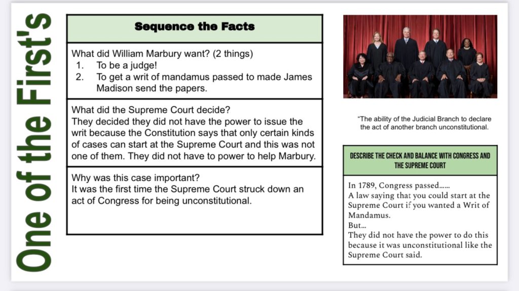 After a timed reading and highlighting session, I had students recall and share out critical case details: What did Marbury want? How did the Court respond? Why was the decision so impactful? We documented responses on a visual Thick Question slide to emphasize the role judicial review plays in the system of checks and balances.