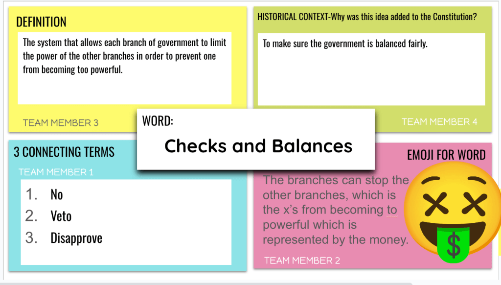 After about 10 minutes of circulating to check understanding and give feedback, I transitioned the class into a digital Frayer Model template. This followed nicely from the Repuzzlers they had just completed sorting and defining. I utilized a Frayer Model template designed by Amanda Sandoval and the lesson within the Frayer was designed by Katie Cherney. (Find this information in the EduProtocols Facebook Group) In addition to the standard Frayer elements defining terms, 3 connecting terms, and historical context, I tweaked the template to also include an emoji representation of each concept along with a justification connecting the emoji back to the vocabulary word. Having students represent abstract government concepts with emojis encouraged creativity and forced deeper connections with the content. Each student was responsible for completing one section of the four-square Frayer template for each term. They chose which component they wanted to own at the beginning by selecting an assigned color. This made accountability built right in, as their part couldn’t be complete until they personally filled in their component across all five vocabulary word slides. My hope was students would paraphrase the definition and use the 3 connecting words from the Repuzzler cards at their desks.
