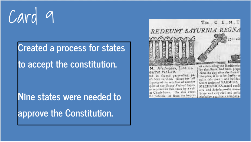 Knowing I wanted to run a “Great American Race” Constitution game on Tuesday, I had students make clue cards to enable that activity. I distributed index cards with a number on one side and a part of the Constitution (e.g. Article 1, 2nd Amendment) on the reverse. Working in small teams, students looked up their assigned Constitutional section in our government textbooks, created two text clues plus an image that related to it, and added the index card number to a slide. After school, I went through their work and selected 11 high-quality student-made slides to use for Tuesday’s Great American Race about the Constitution. This creative prep work got students engaged with the foundational document in advance, even in a condensed 30-minute window.