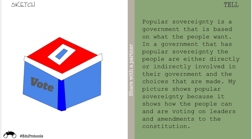 Given time constraints, I used some streamlined protocols shared by teacher Justin Unruh. First we did a CyberSandwich reading activity with leveled texts on popular sovereignty (8th, 5th and 3rd grade). Students took guided notes and then discussed them. Afterwards, I provided options for a paragraph summary or visual sketch to demonstrate their understanding. Next, utilizing an Annotate and Tell, we examined key excerpts from the Constitution’s Preamble and Article I, plus the Declaration. Students highlighted and analyzed sections related to popular sovereignty and checks on governmental power. Some analysis questions I asked included: What mechanism does the Declaration say people have to control government? And how do Constitutional sections allow people to restrict political influence?