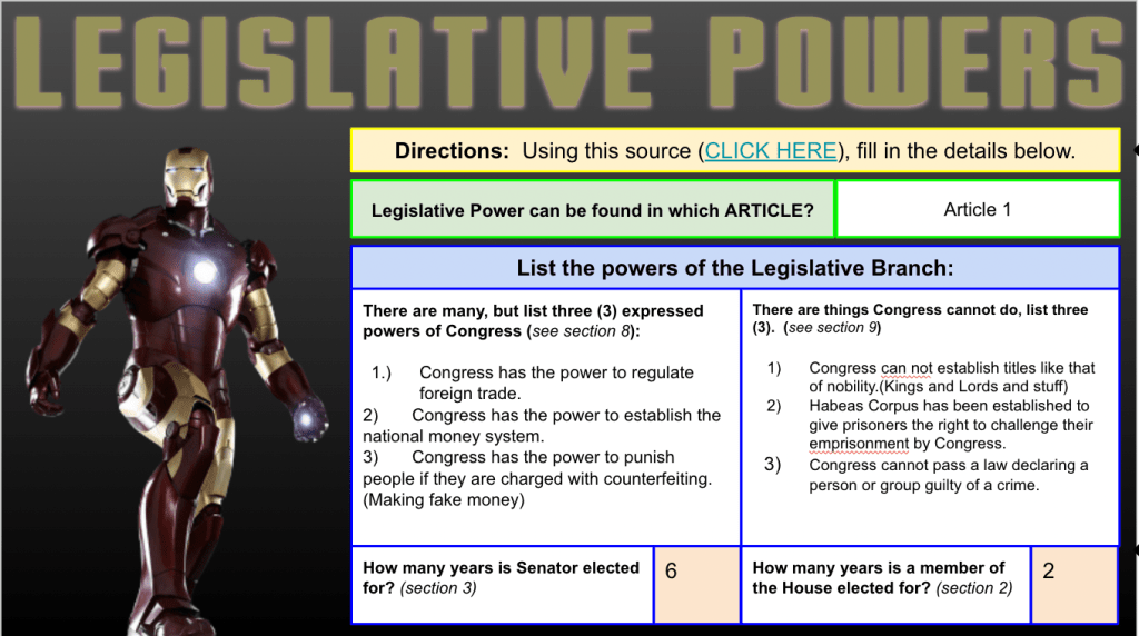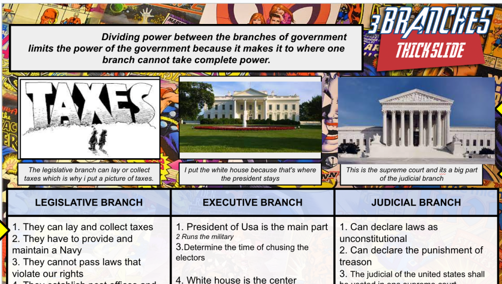 To wrap up, I encouraged students to revisit the informational slides they made yesterday documenting details on branch functions. I prompted them to mine that content to integrate an appropriately themed superpower or two. We will need just a bit more time next Tuesday to let them finish fleshing out their governmental superheroes. I’m looking forward to seeing their creative takes translating the legislative, judicial and executive duties we studied into heroic embodiments!