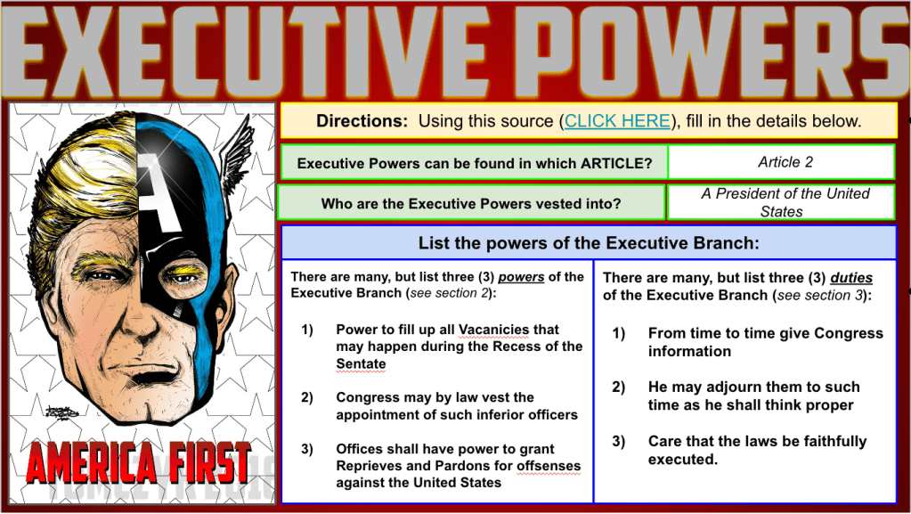 I then shared an Iron Chef EduProtocol created by teacher Dominic Helmstetter. Students consulted the Constitution to research details on the legislative, executive and judicial branches for a slide, with some also using provided readings I condensed via AI. Their tasks included defining specific branch powers, identifying which articles established them, how members are selected, etc. I gave them 10 minutes to find facts and design slides. Finally, everyone combined their branch expertise into one Thick Slide summary, including images and the four most vital points on each one’s roles. I also had them analyze how division of power itself limits authority and potential despotism, referring back to the introductory rope demonstration.
