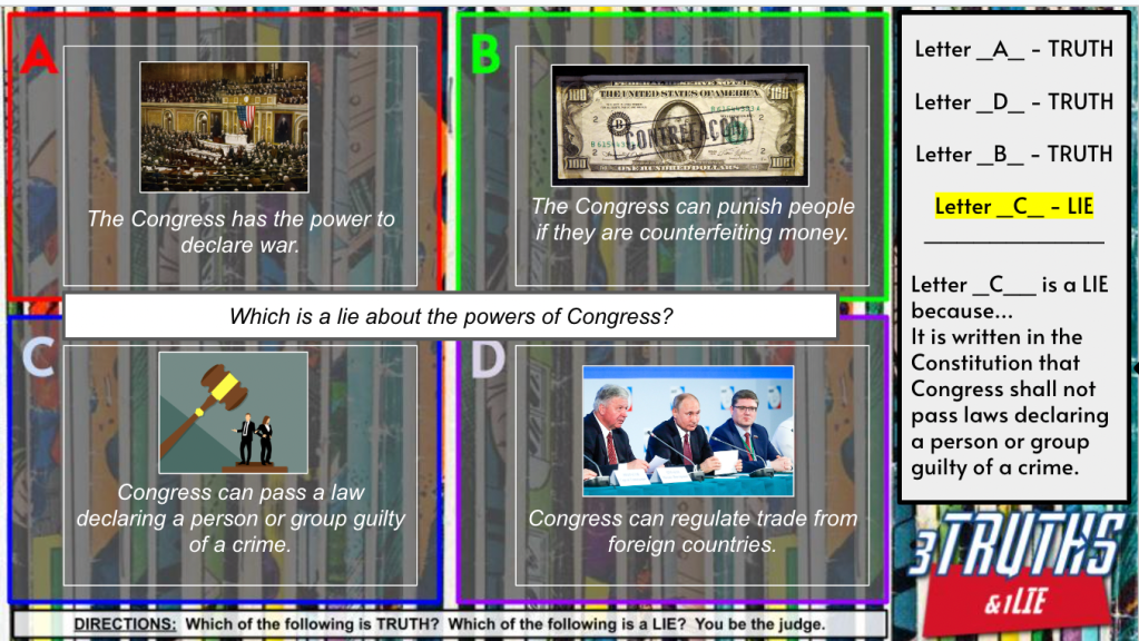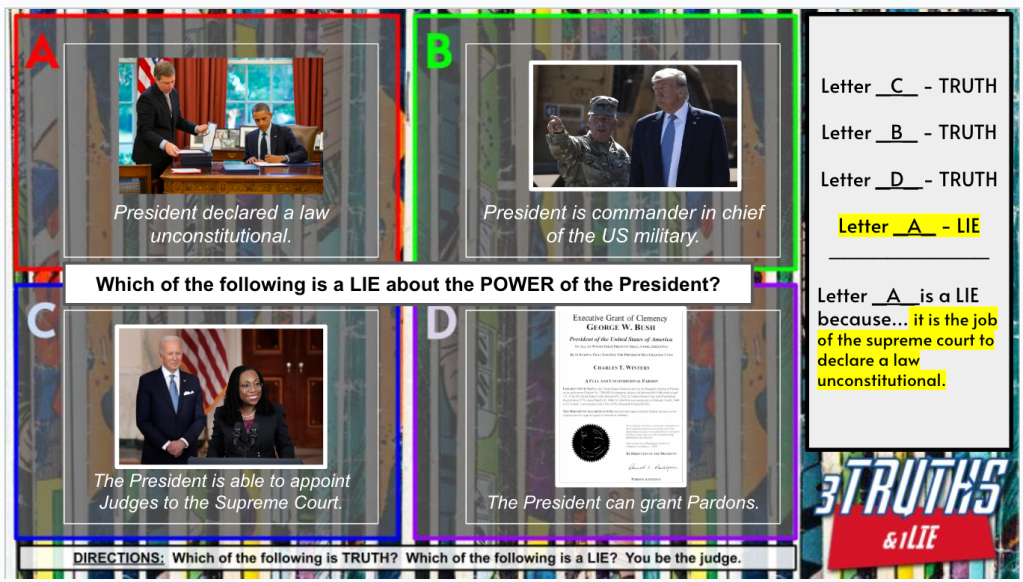 After that quick review, we went over the “3 Truths and 1 Lie” slides (template created by Dominic Helmstetter) about the branches of government that students completed last Friday. I compiled their work into an 11 slide deck that I displayed in slideshow mode. For each slide, students had to analyze the 4 statements and decide which one was the lie. They recorded their guess and reasoning on an organizer worksheet. Once everyone made their prediction, I advanced to the next slide that revealed the correct answer.