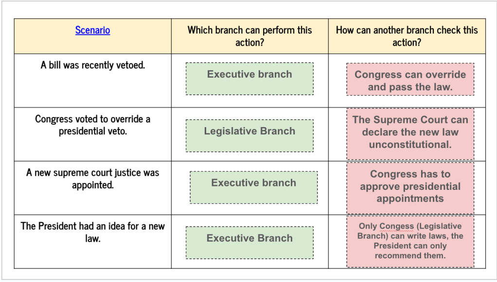 - Next, I gave each student a detailed checks and balances chart categorizing actions available to each government branch, alongside branches with checking power. Students read three basic scenarios that required inferring nuanced applications of checks and balances. For example, I had the scenario of, “A potential bill was vetoed.” Students ahd to figure out which branch of government could veto a bill. Then they had to figure out which branch of government could check that action.