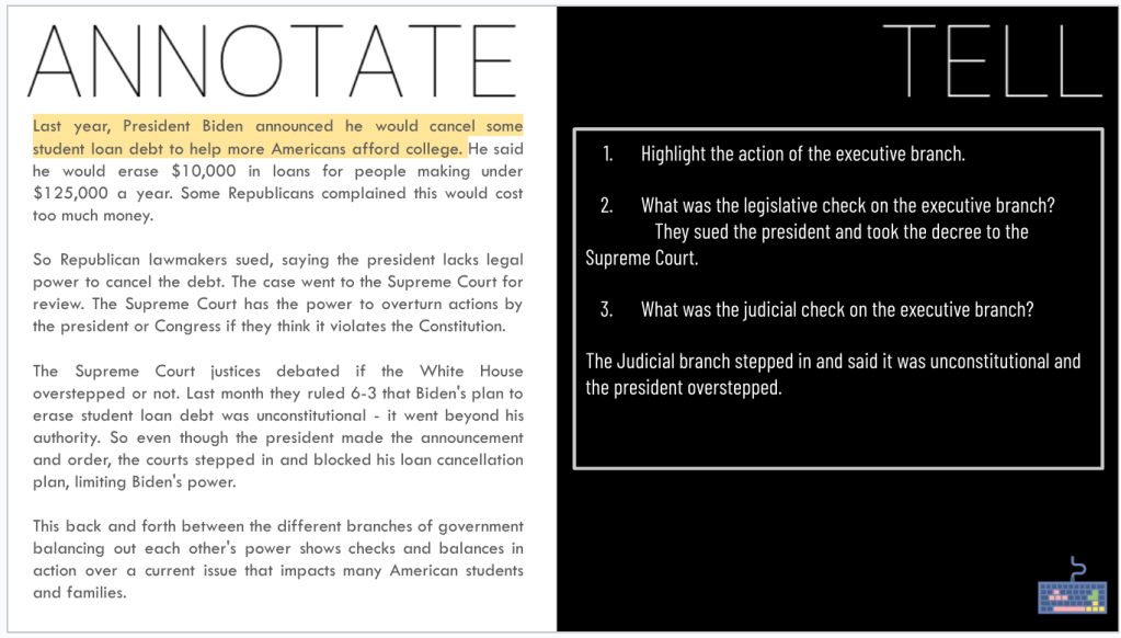 - Students then examined 3 AI-generated short stories based on recent controversies that activated checks and balances: Trump’s impeachment, Obama’s gun orders, and Biden exploring student debt cancellation. After annotating key executive actions, students completed analysis questions per story such as: How did the legislative branch check the president here?