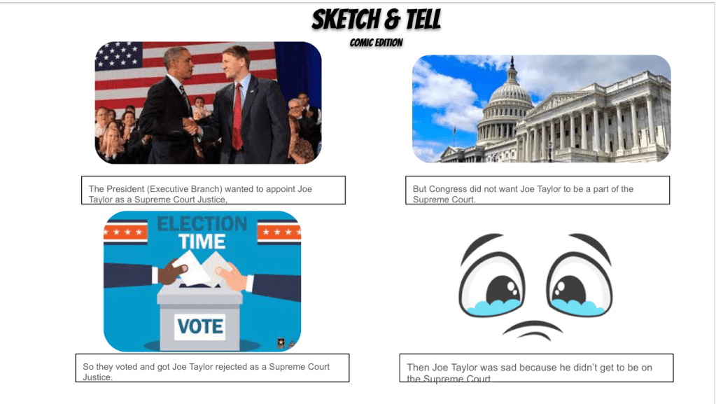- Finally, I used a Sketch and Tell comic framed with “SWBST” (Somebody, Wanted, But, So, Then) storyboarding technique. Students illustrated either an original scenario demonstrating checks/balances or chose one AI generated story from the earlier activities to depict visually. As they shared out creations, they articulated detailed descriptions of multiple characters across branches interacting via through checks and balances.
