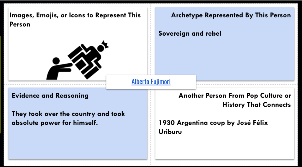As a final analysis task, I had students assign Fujimori an archetype to encapsulate his spirit and actions, citing specific evidence to justify their categorization. Many comparisons emerged between Fujimori and iother people throughout history.