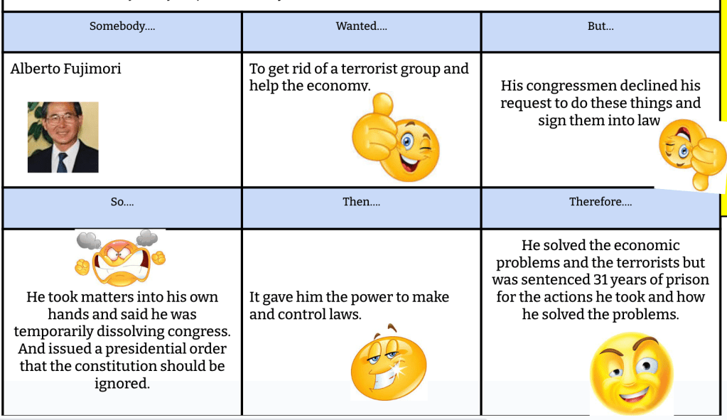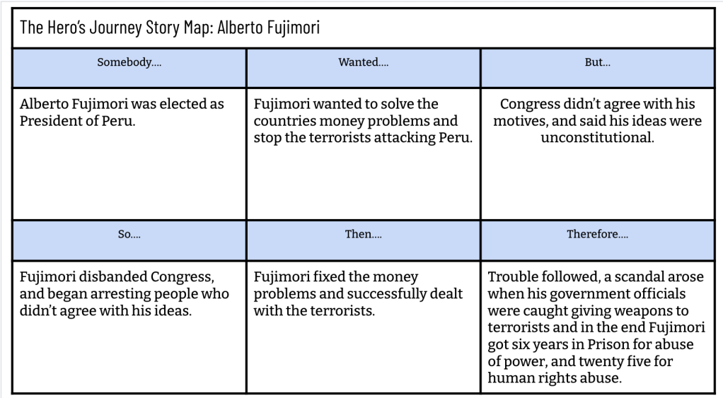 The profile revealed how, once elected president, Fujimori slowly seized near-dictatorial control: dissolving Congress, rewriting the constitution, and severely curtailing civil liberties. To process this complex chain of events, students mapped out Fujimori’s escalating actions on a template I customized for narrative sequencing.