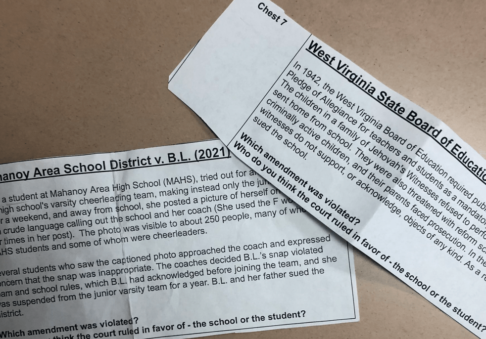 The cases I pulled focused on timely topics like the Pledge of Allegiance, social media speech, school punishment policies, and praying in school. I printed each case summary onto cards and placed them into envelopes around the room, along with one envelope that contained a bonus Bill of Rights Quizizz (which the classes now averaged 91% on!).