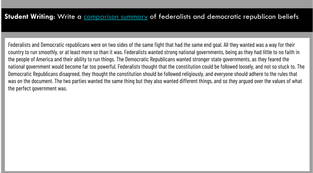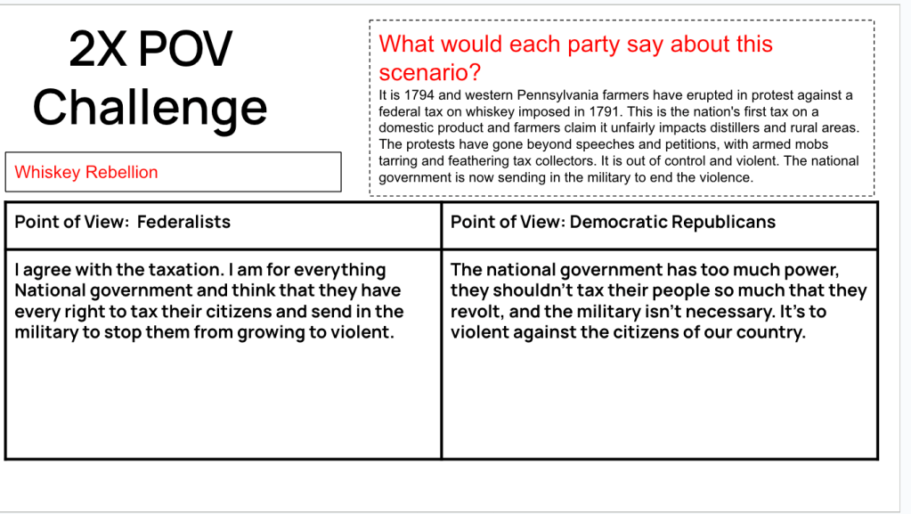 Lastly, we used a 2xPOV template from Josie Wozniak and I gave the students a scenario to practice writing from the perspective of a Federalist or Democratic Republican. I used Claude to generate a basic 3 sentence scenario about the Whiskey Rebellion. Students had to take the beliefs they learned about and apply them to understanding how a Federalist or Democratic Republican would respond to the Whiskey Rebellion. I was looking for responses that showed the Federalists wanted a stronger national government and that farmers needed to pay the tax. The Democratic Republican response I was looking for was that the government was too strong and the use of the military was too much for such a minor event. The students struggled with this a lot. I understand why………The start of this lesson with a Gimkit for recall was at a DOK 1 level. The concept sort and CyberSandwich are DOK 2. The 2xPOV is a DOK 3 level of learning, requiring strategic thinking and justification beyond factual recall. Students had to put themselves in the shoes of political party members to voice informed perspectives on an event. They would have to synthesize their understanding of party stances, priorities and fears to construct an argument around the Whiskey Rebellion from each viewpoint. So the students were struggling because sometimes classrooms fail to get past DOK 1 or 2. We ran out of time for another Fast and Curious activity.