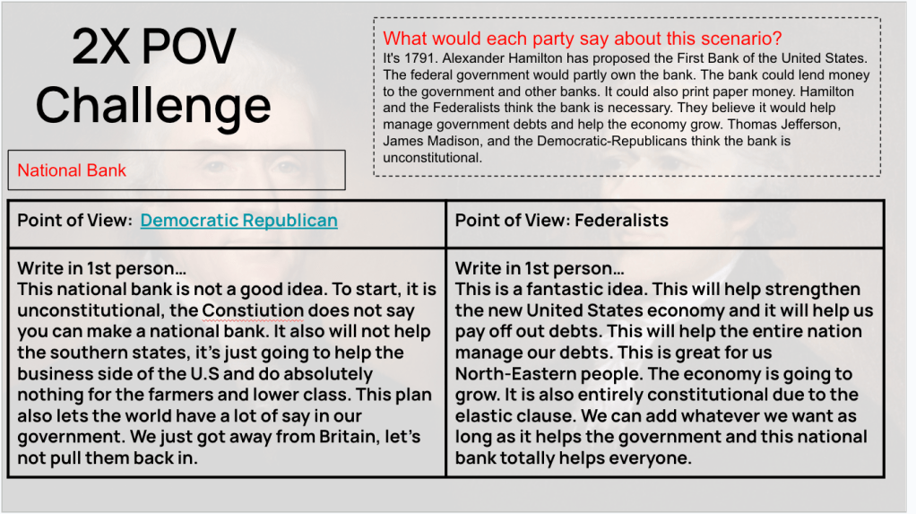 - 2xPOV – Students completed another 2xPOV analyzing the bank from the perspective of a Federalist and a Democratic Republican.