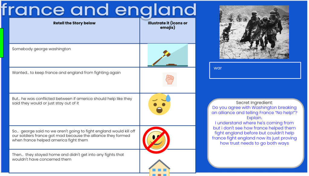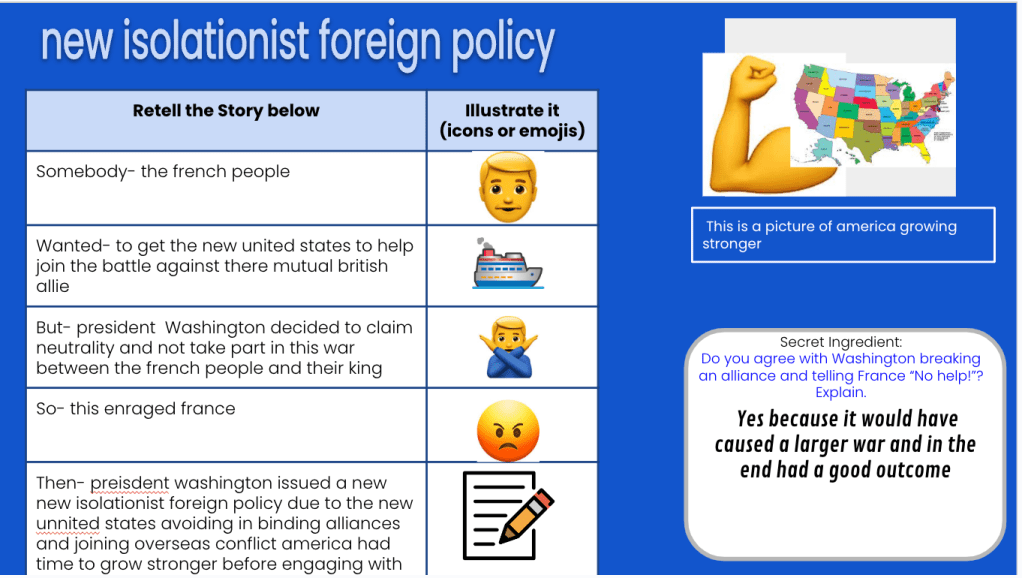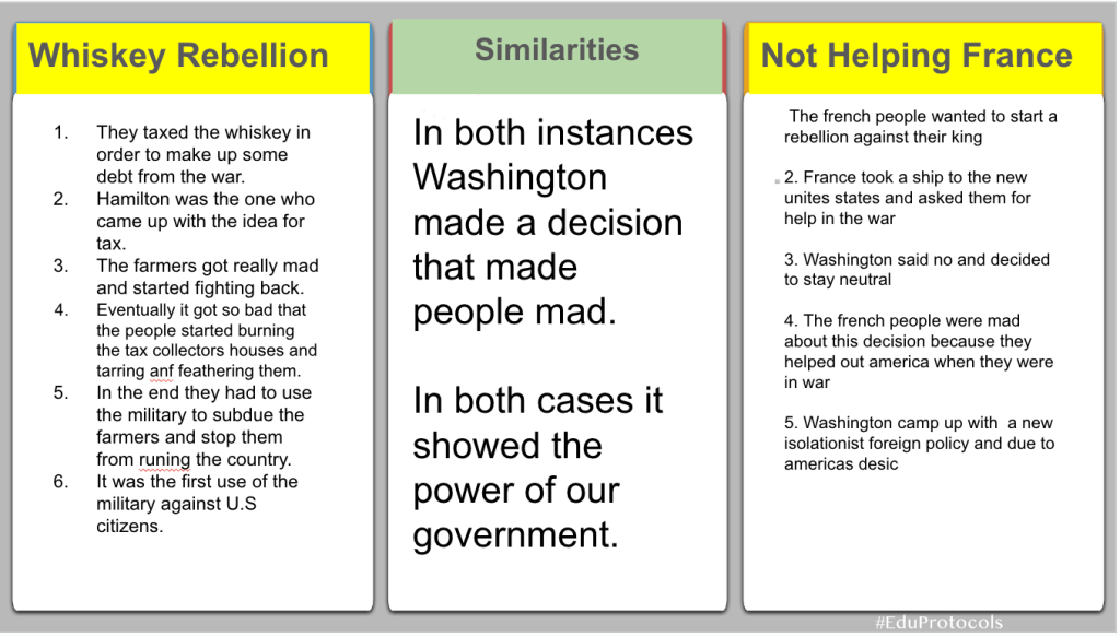 On Friday, we moved into Washington’s presidency. I asked: “Did Washington’s crackdown on the Whiskey Rebellion and neutrality stance favor the Federalists or Democratic-Republicans?” Students shared an Iron Chef slide with a partner. I explained if you can keep this “Somebody, Wanted, But, So, Then” framework in mind as you read, it will help you comprehend and remember what you read.