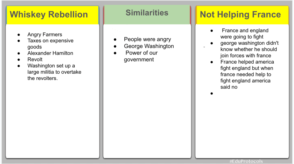 First, we discussed what a precedent is and what it meant. Then students had 3 minutes to find and share a precedent Washington set. Next, students shared a slide, with one reading and creating a slide about the Whiskey Rebellion and the other reading about neutrality. After 14 minutes, they taught each other their topics and compared the domestic (Whiskey Rebellion) and foreign policy (neutrality) issues.