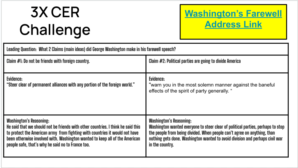 Finally, they completed a 2xPOV responding to either topic from the Federalist and Democratic Republican perspectives. For one class, we had 15 minutes left and completed a 3xCER about Washington’s Farewell Address, with students matching paraphrased parts to quotes from the speech. Then they used claim, evidence, and reasoning to answer: “What 2 main ideas did Washington make in his speech?” I was impressed!