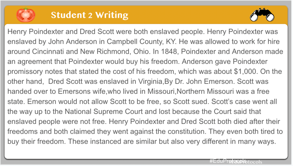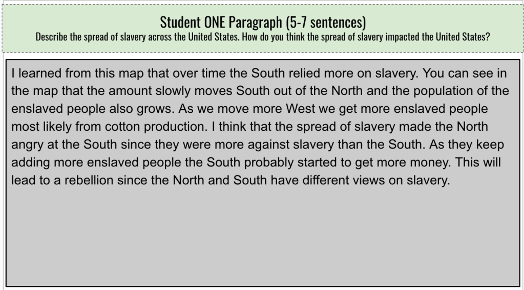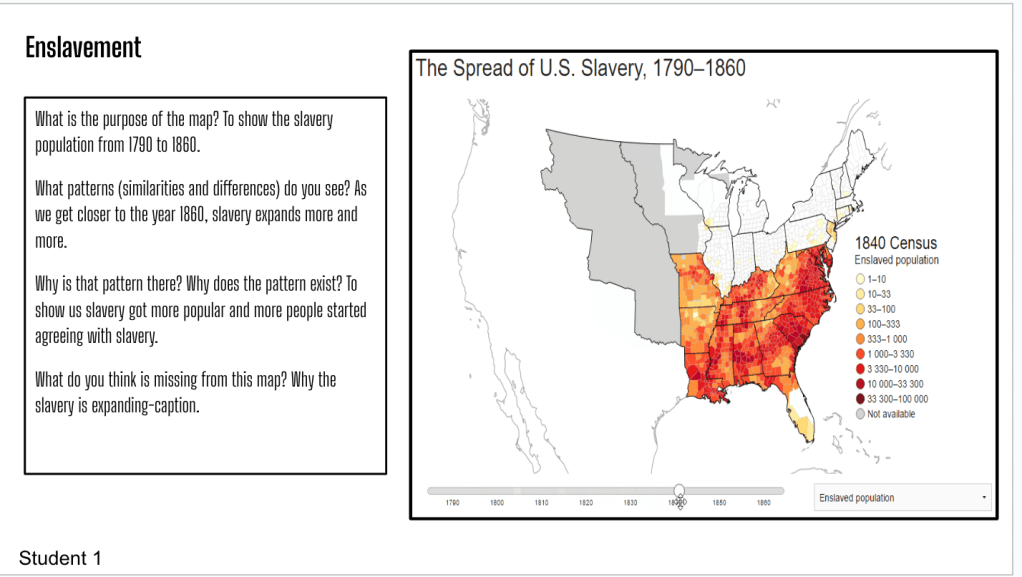 It turns out the assignment I posted still had a textbook section from last year still linked. In the last year, TCI has changed the wording for most of their textbook chapters. Now they include “enslaved persons”, “enslavers”, “freedom seekers”, etc. I asked the students if they noticed the changes. Most of them didn’t notice. This led to a discussion of language changes and the why behind it.