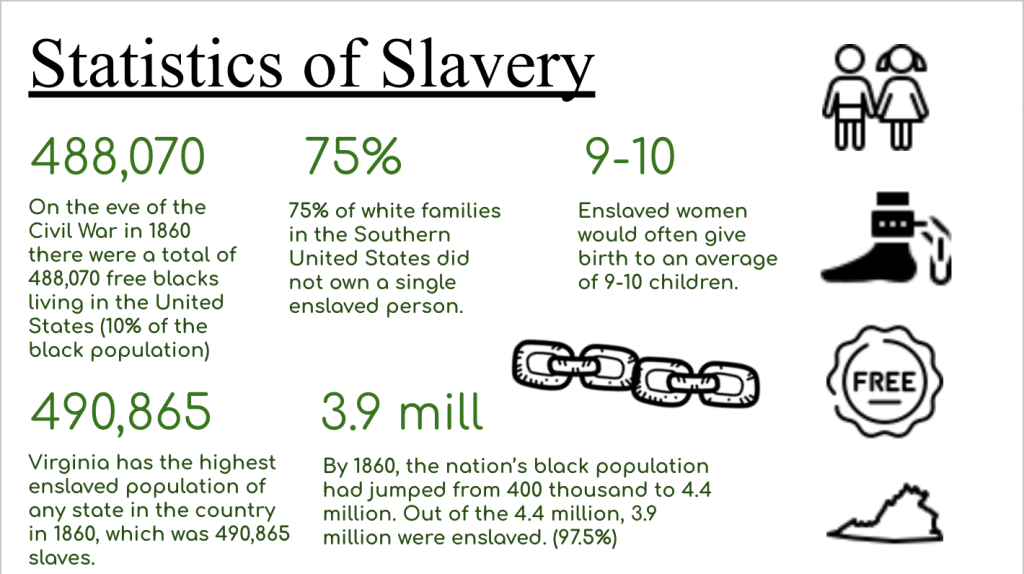 Next we switched to a Number Mania with an article of statistics about slavery written by Henry Louis Gates. I gave students 10 minutes to read the article and highlight numbers and facts that surprised them, or challenged something they thought as true. Most students highlighted 7 to 8 numbers. Next, I had students choose their top 5 numbers and facts. I gave students the rest of class to add 5 numbers and facts, and a title to their Number Mania slide.