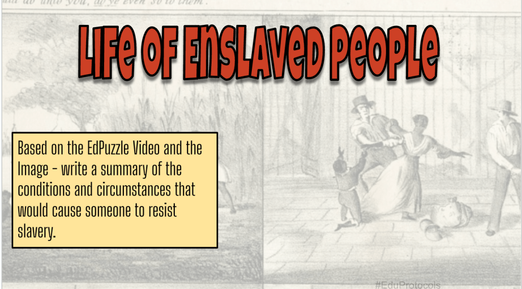 I decided to cut this down to conditions of enslaved people and methods of resistance. I ended up finding, and adapting, a lesson on methods of resistance that included the risks of resistance. It ended up working out nicely with some EduProtocols.