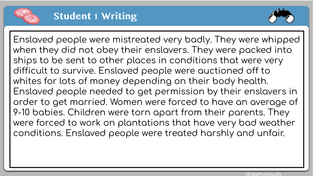 After analyzing the image, students then discussed and compared notes with a partner. As the final piece, students wrote a summary on why the harsh treatment of enslaved people would have prompted resistance. The students used information from the EdPuzzle video along with observations from the image analysis.