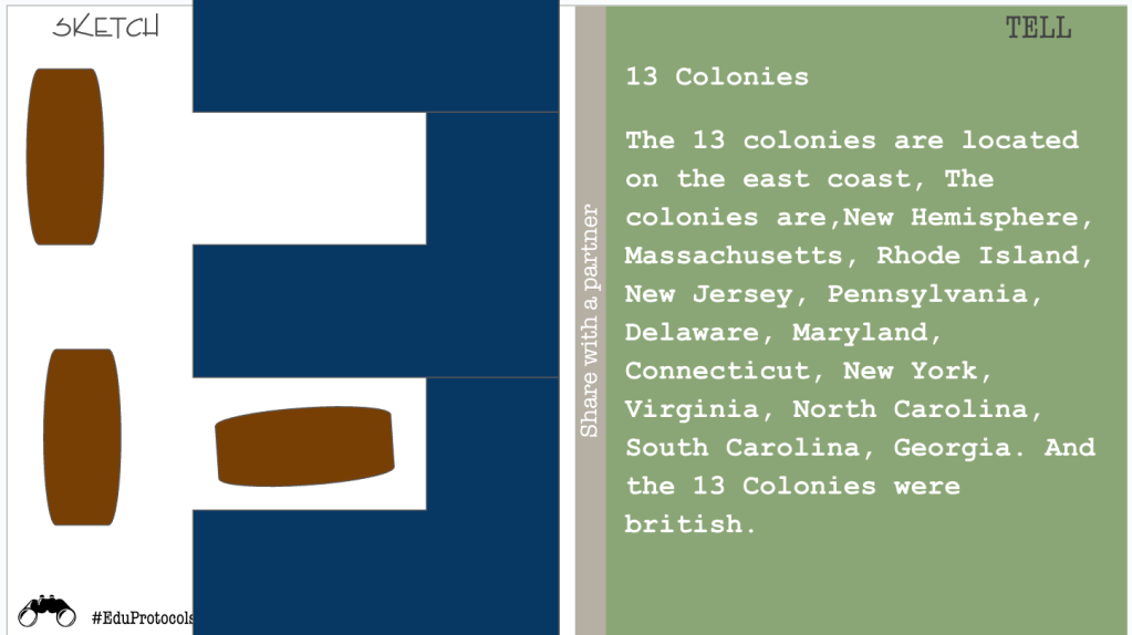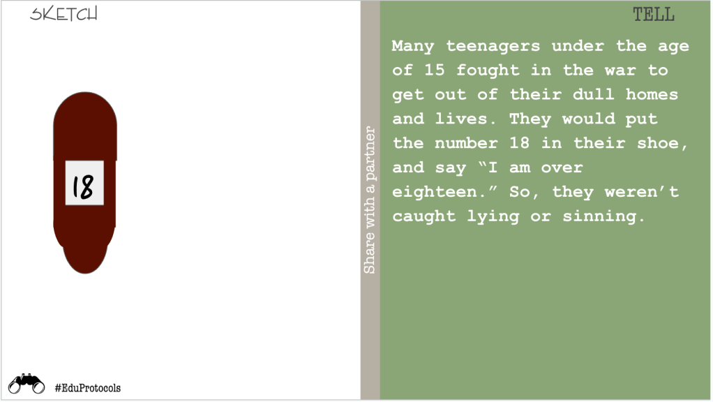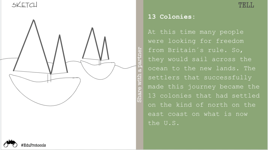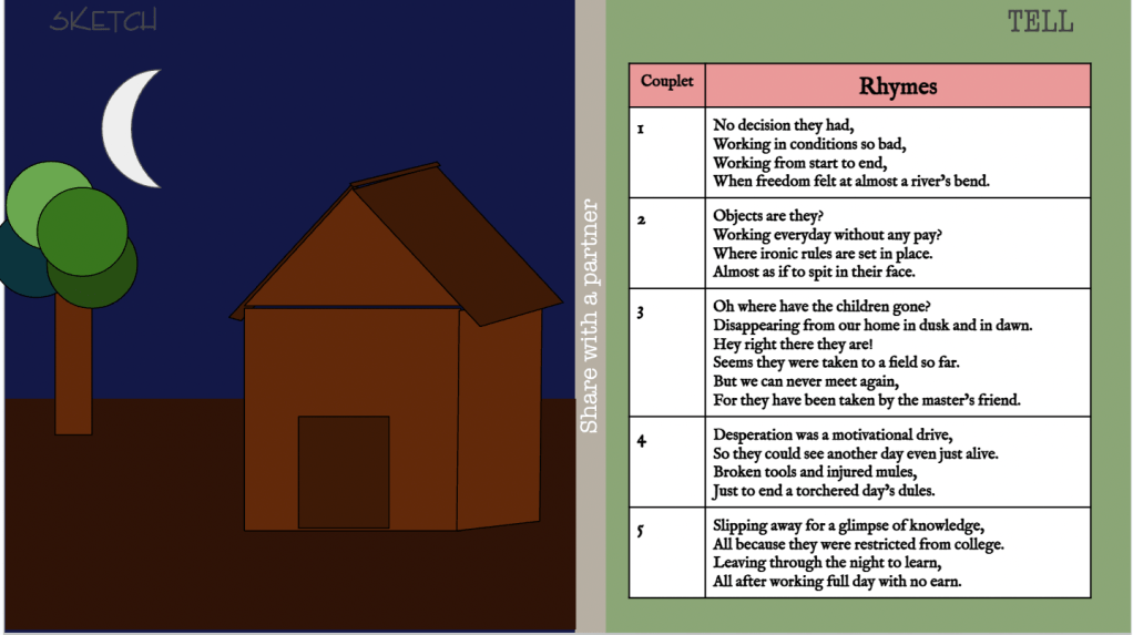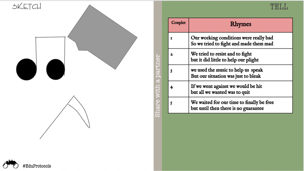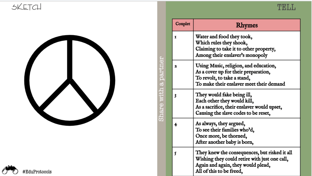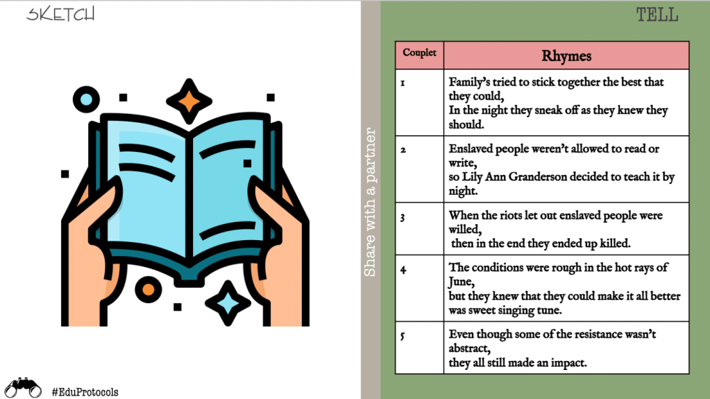 To finalize the lesson I smashed together some Retell in Rhyme and Sketch and Tell. These two protocols seem to fit nicely together. Students were tasked with retelling the stories of resistance using rhyme and then illustrating their poems with visual representations. While Retell in Rhyme promoted creative expression, the Sketch and Tell component enhanced the students’ ability to convey specific details through visual representation.