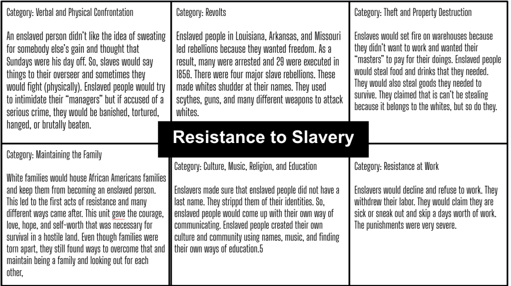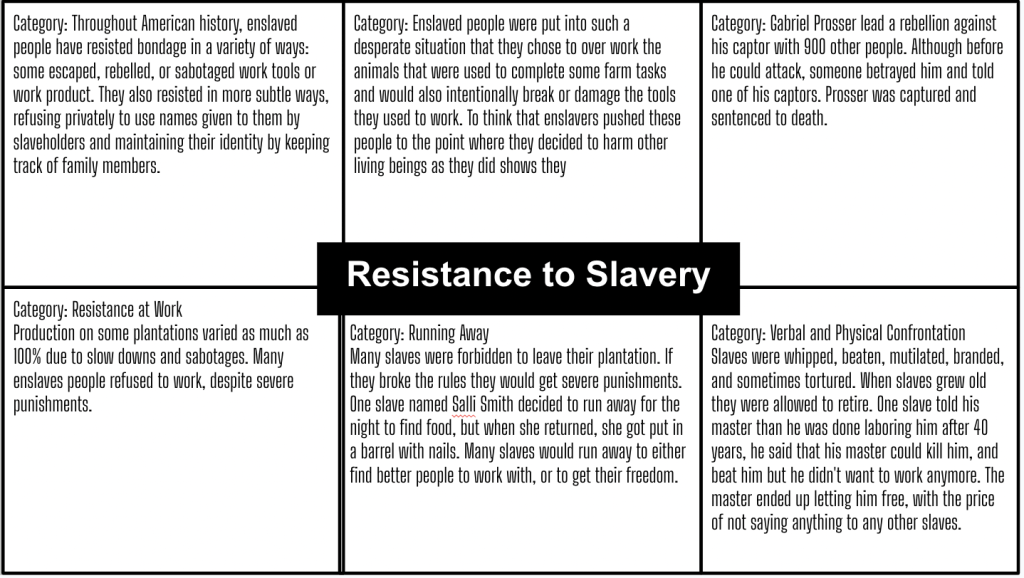 To provide a comprehensive understanding of the various forms of resistance, we divided the concept into distinct categories: music, runaways, physical aggression, revolts, etc. There were 7 different categories. Each category was distributed throughout the room, and the stories of resistance concealed within envelopes. Students formed groups and used a Frayer to collect resistance notes as they went from envelope to envelope. There were over 30 different stories of resistance within the envelopes. As a result, some of the groups had different information.