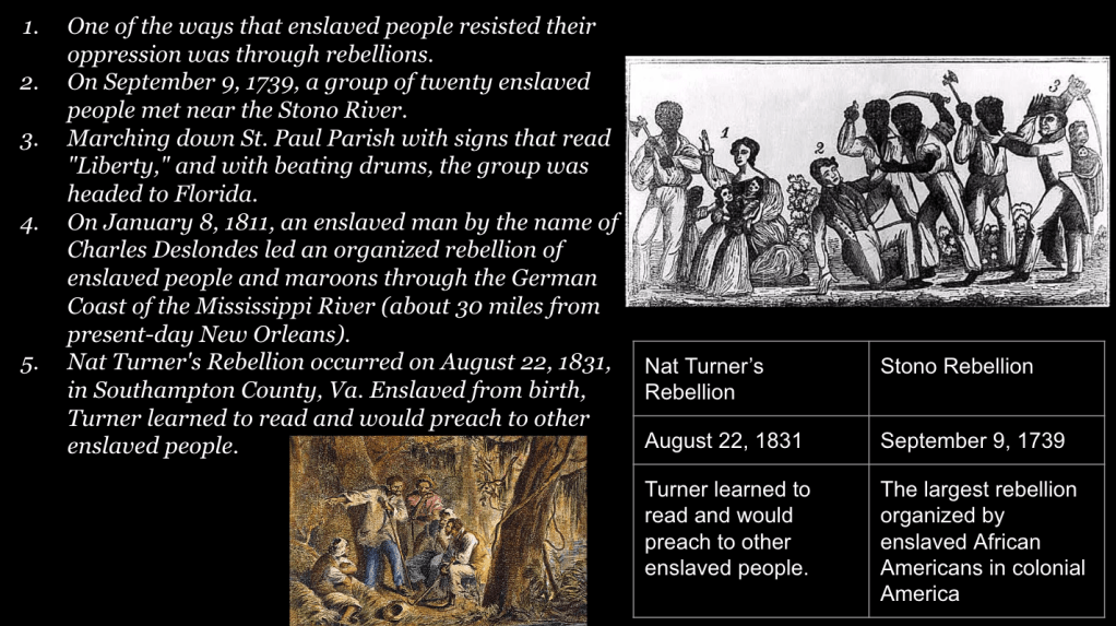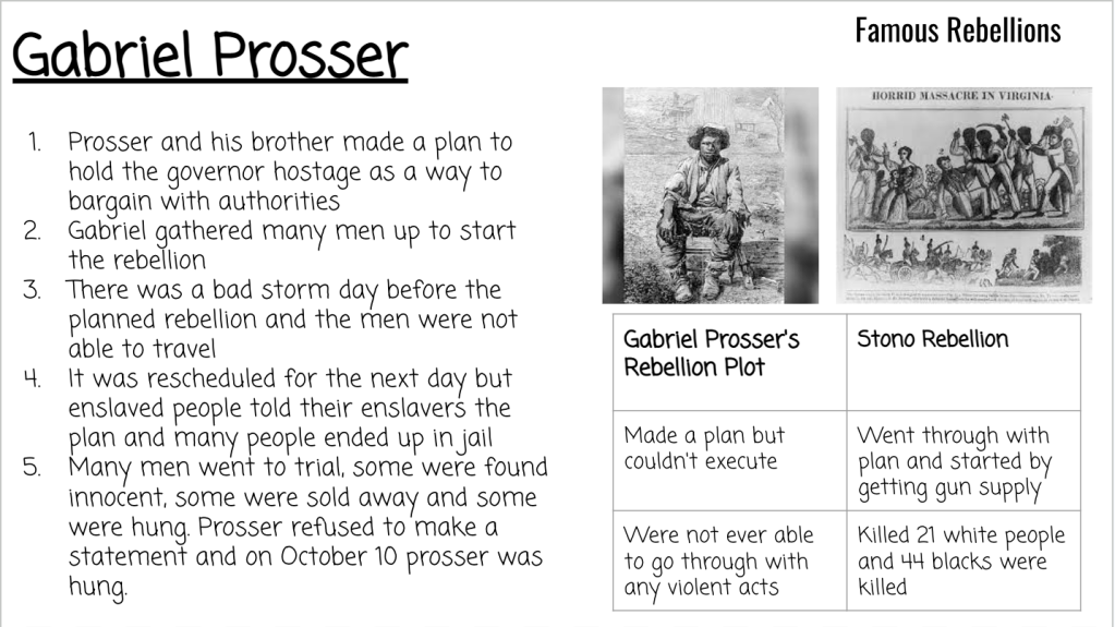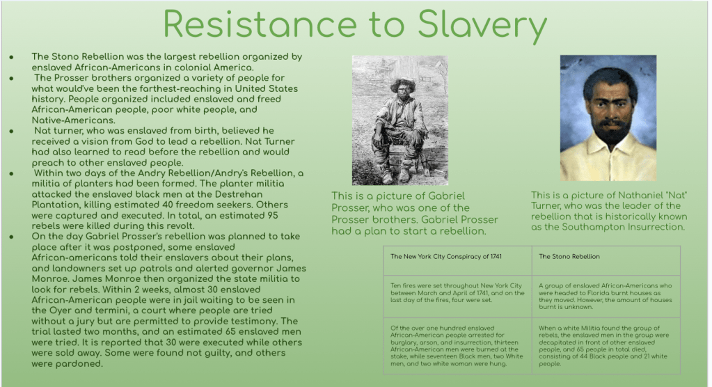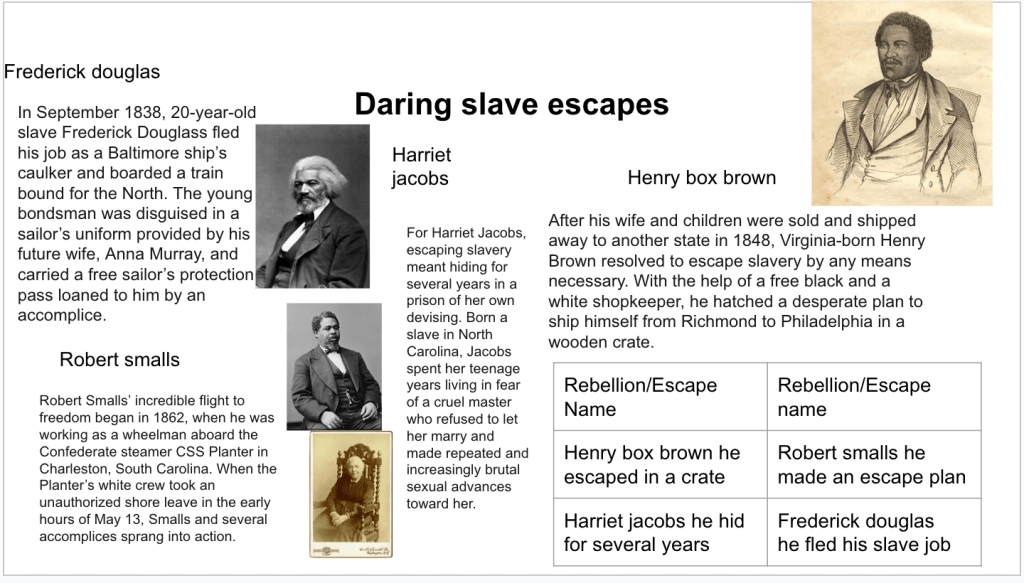 Given the limited time and resources at hand, I prepared a thick slide template for my students. The goal was to encourage them to choose a story from either the revolts or escapes category. The revolt stories included the Stono Rebellion and Nat Turner’s revolt, while the escape stories encompassed narratives such as Frederick Douglass and Henry “Box” Brown, among others. The template required students to include a quote, five important facts, relevant pictures, and draw comparisons between their chosen story and another.
