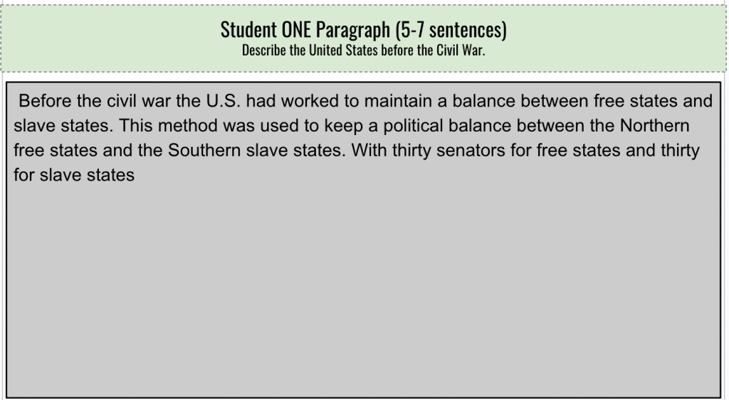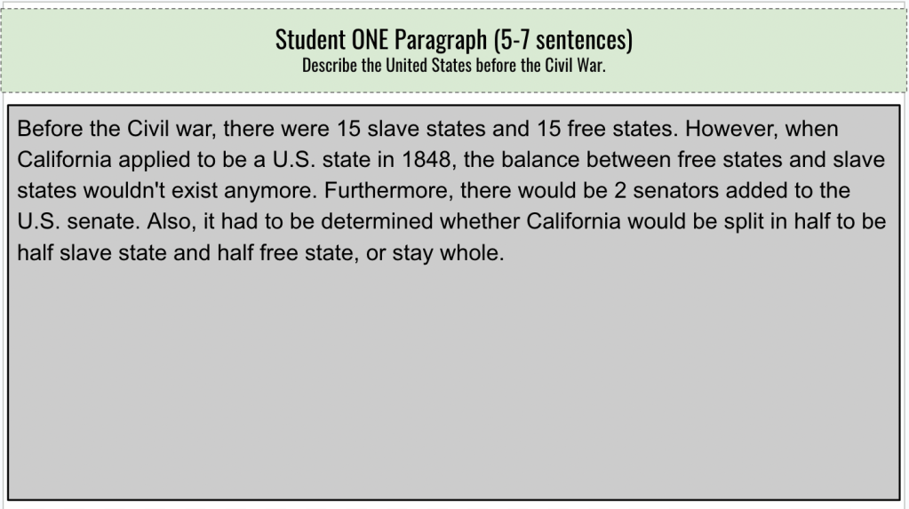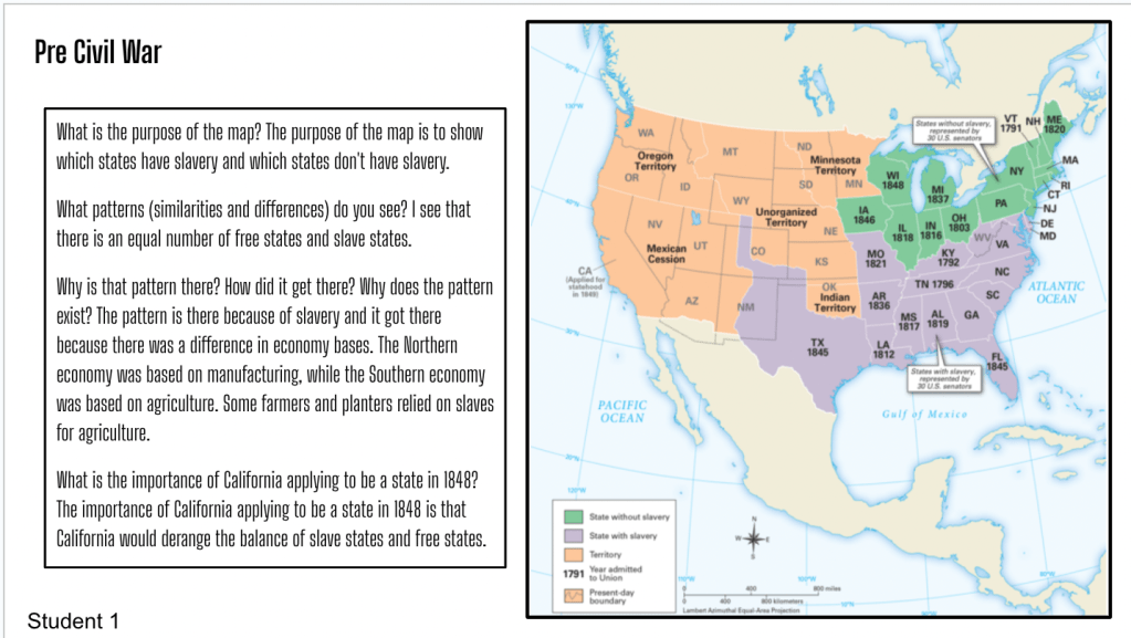 After the 15-20 minute timer went off, we switched gears to delve into the pre-Civil War era. I began by emphasizing the cause of the Civil War was slavery. To deepen their understanding, I introduced a MapWich activity. The map displayed an even distribution of free states and slave states. At some point, I drew a line between “North” and “South” and the students immediately noticed the presence of Missouri above the line and questioned why it was allowed to be a slave state. Additionally, they observed that California’s pending admission would disrupt the delicate balance between free and slave states.