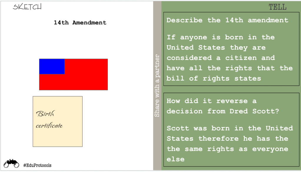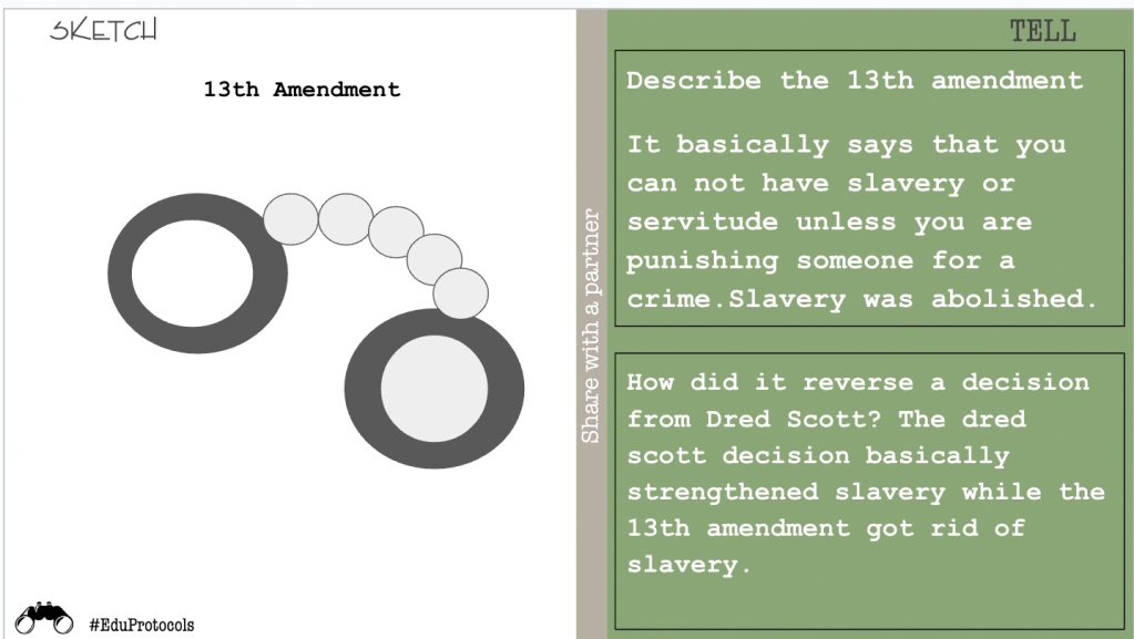 To further our exploration, we connected the Dred Scott case to the 13th and 14th Amendments, which had profound implications for civil rights and the overturning of the infamous decision. Employing a Sketch and Tell activity, students utilized Google Shapes to create visual representations of the 13th and 14th Amendments.
